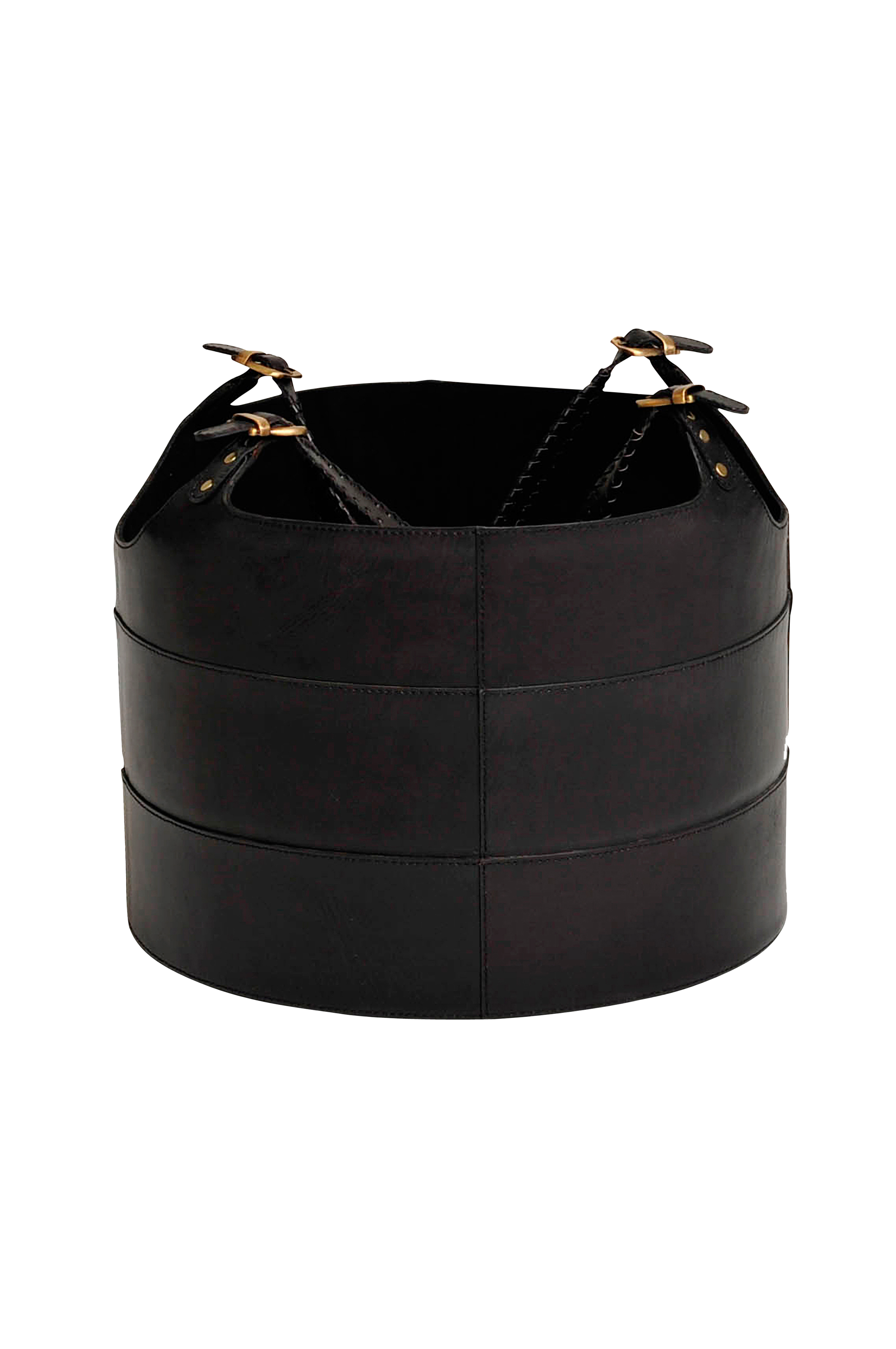Nahkainen halkokori, jossa kahvat.