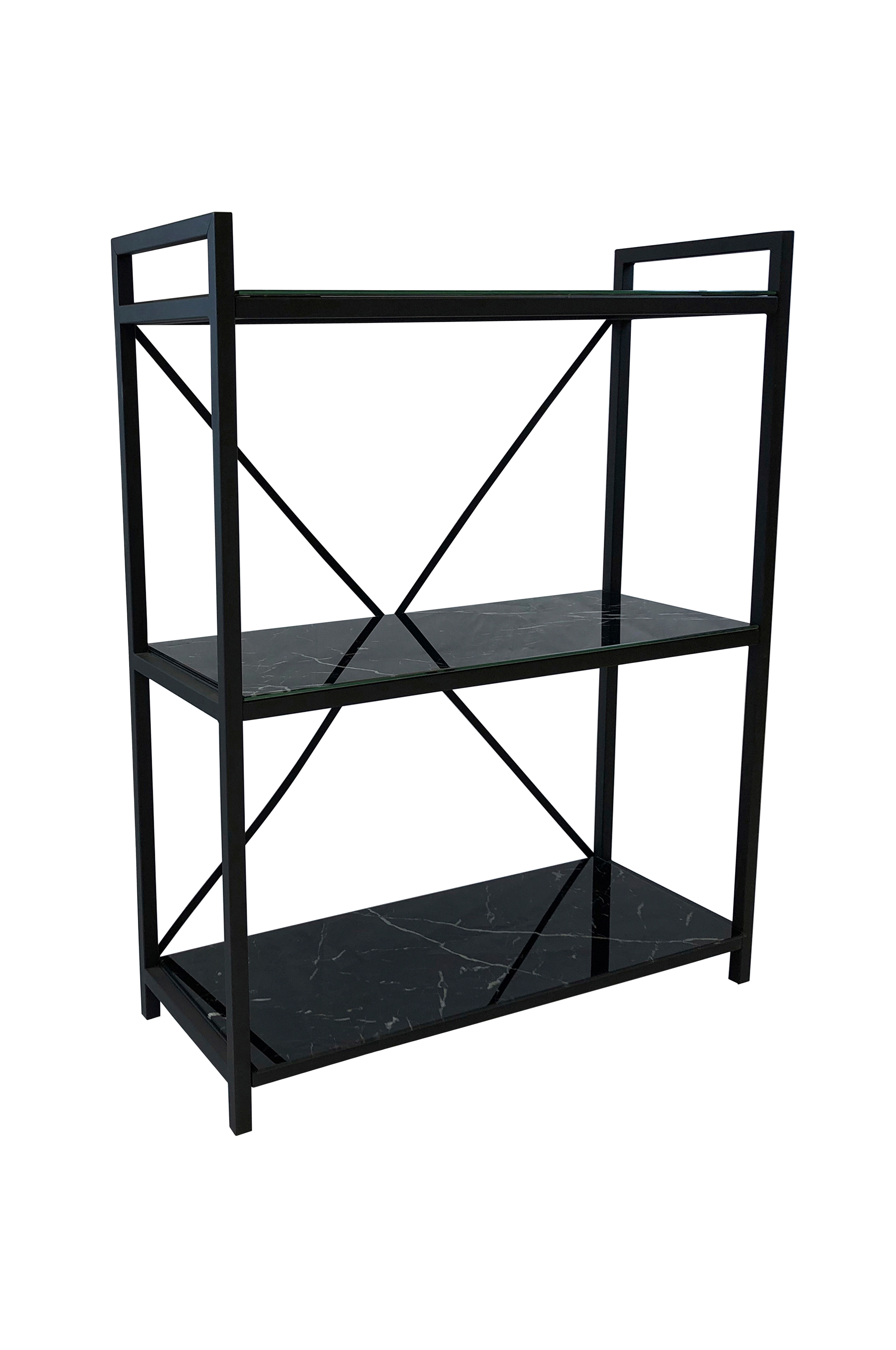 Hyllykkö marmoroitua lasia, runko maalattua metallia.Leveys 75,5 cm, syvyys 30 cm ja korkeus 96,5 cm.Koottava.