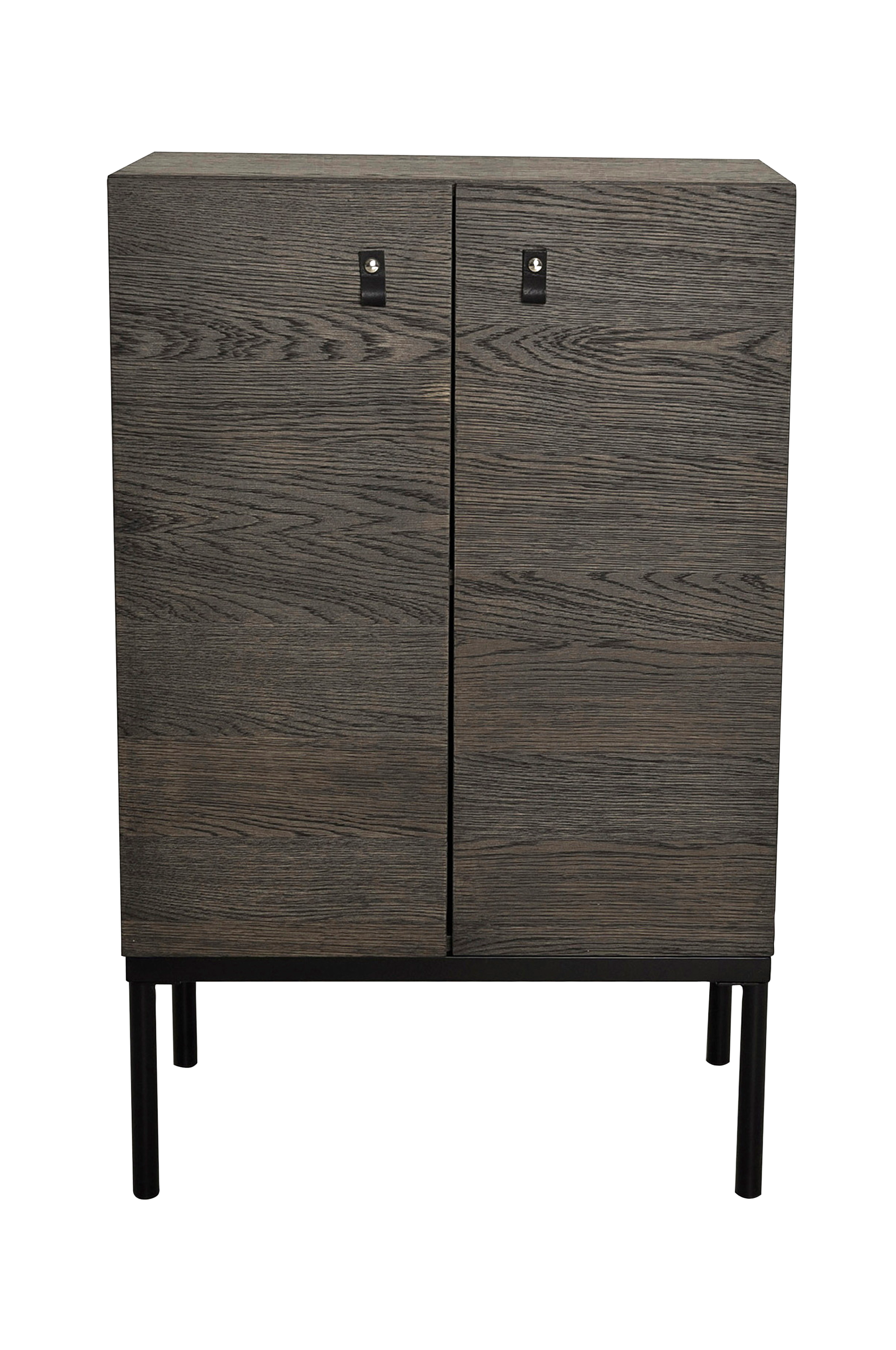 Kapealinjainen kaappi lakattua tammiviilua. Metallijalat.2 ovea, joissa nahkavedin. 1 kiinteä hyllytaso (2 lokeroa).Toimitetaan osina.Leveys 60 cm, syvyys 35 cm ja korkeus 95 cm.