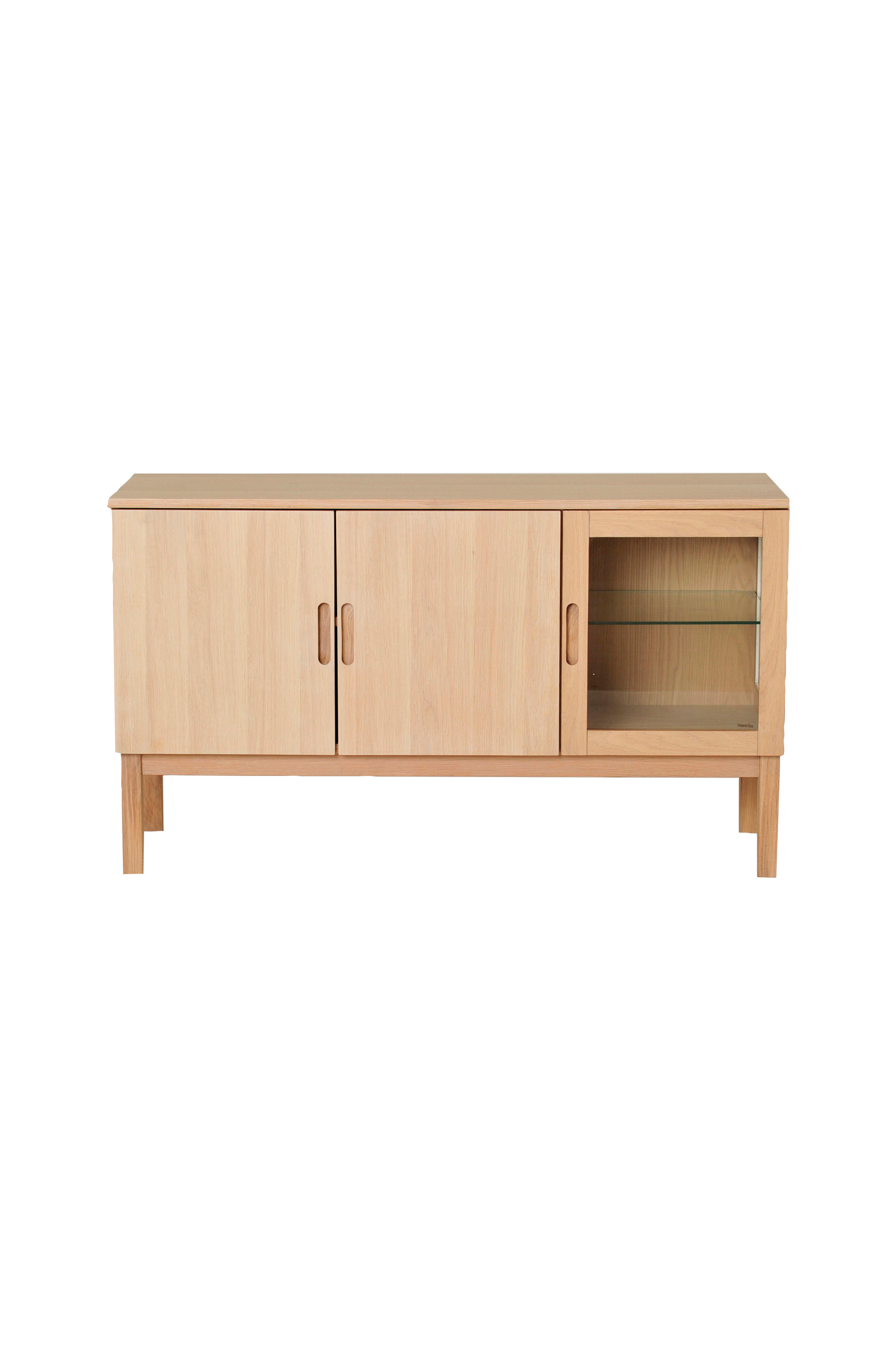 Senkki, jossa karkaistua lasia ja LED-valot.Lakattua tammiviilua ja MDF-levyä. Siirrettävät hyllytasot.