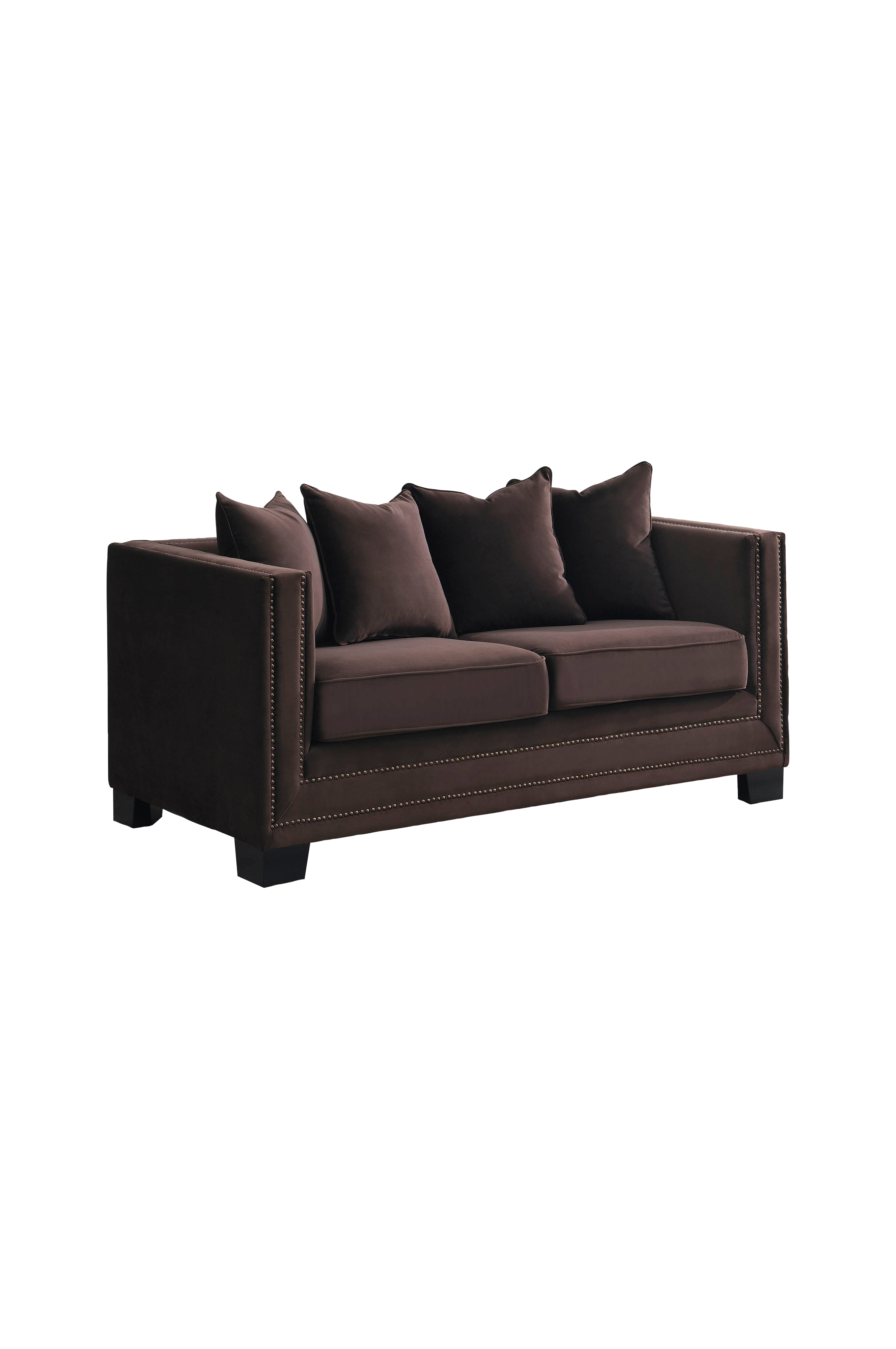 Veluurisohva, jossa pronssinväriset koristenastat. Maalatut puujalat. Mukana 4 tyynyä.