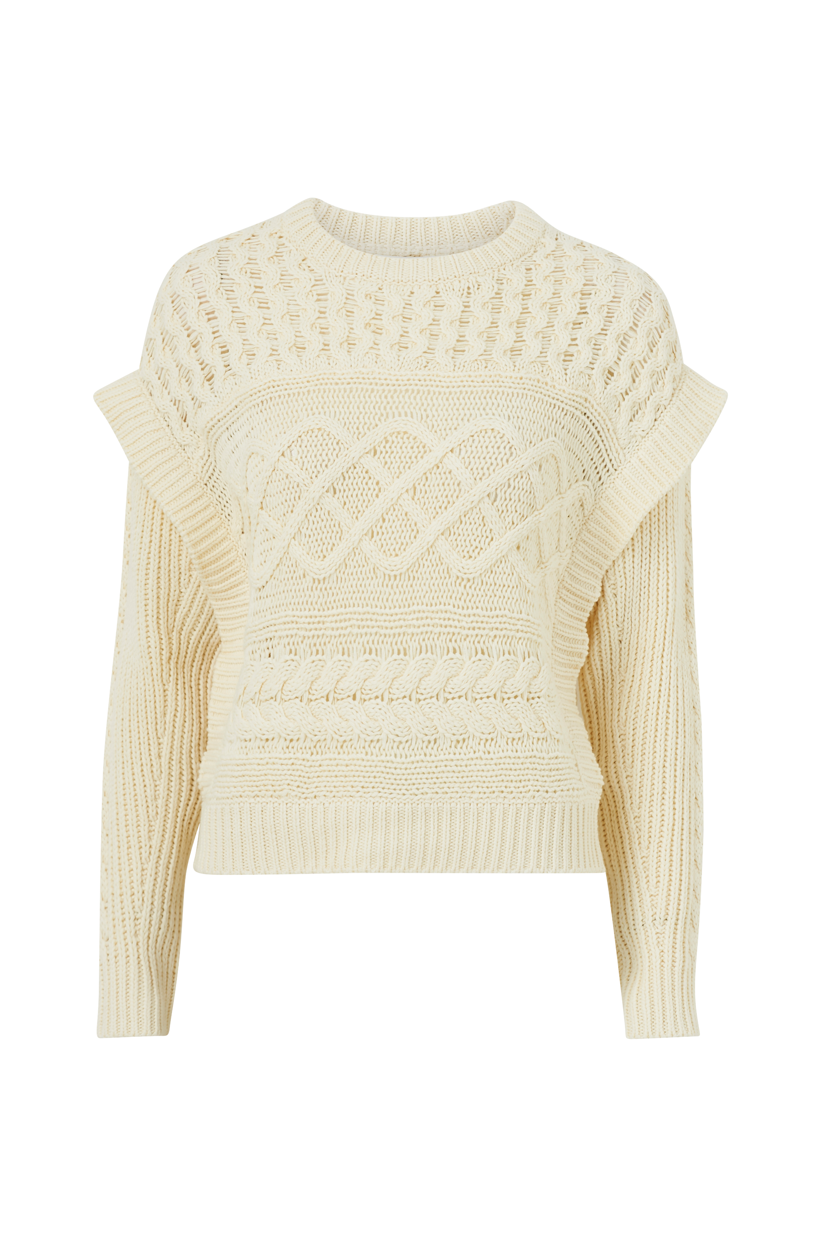 Object objMala L/S Knit Pullover 110 -neulepusero puuvillasekoitetta. Struktuurineuletta edessä ja takana. Madalletut olkapäät ja olkapääsaumassa sekä sivuilla joustinneulereuna/-röyhelö. Joustinneulereuna helmassa, hihansuissa ja pääntiessä.