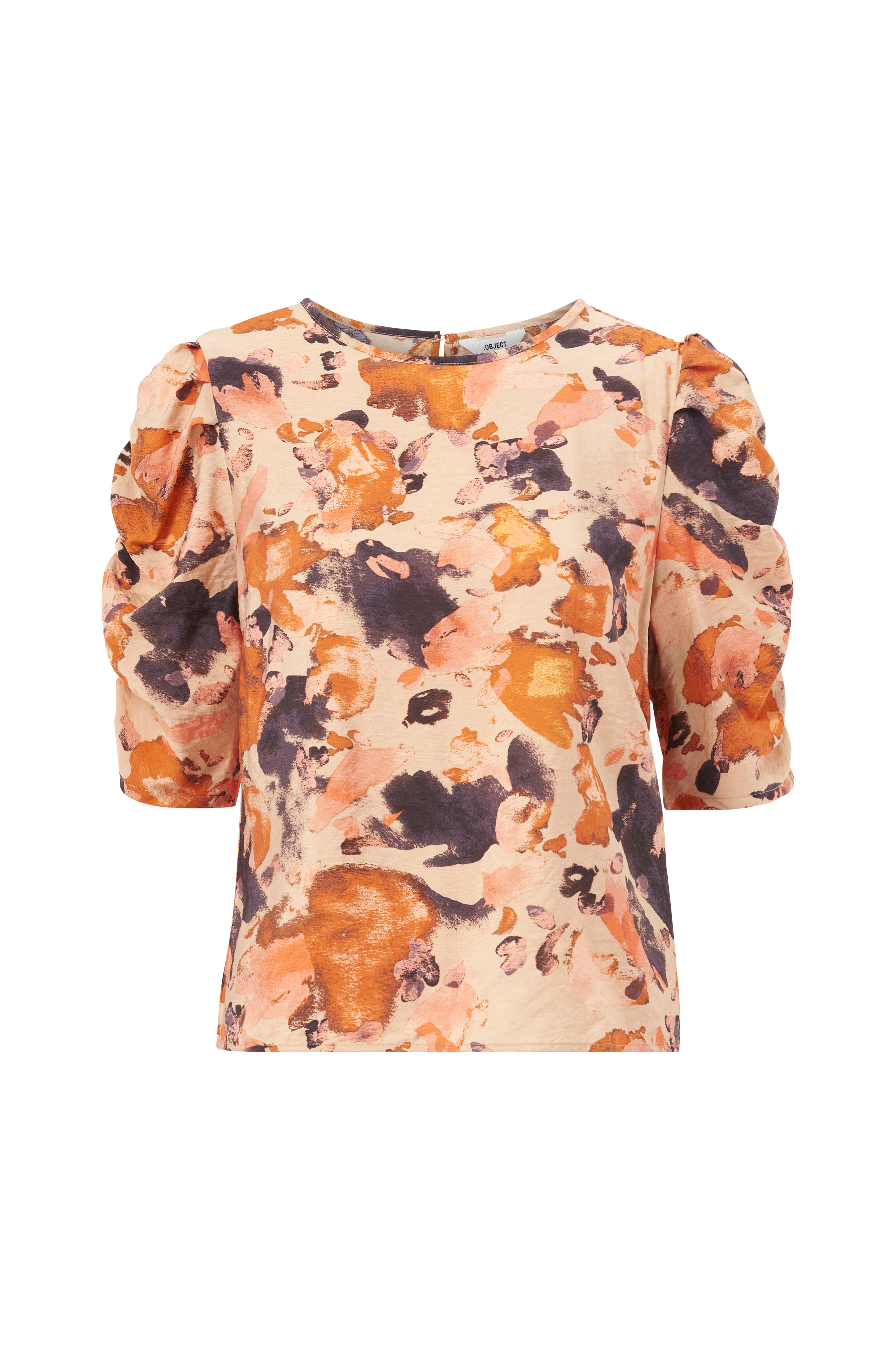 Paita kuviollista, pintakuvioista viskoosia. Puolipitkät puhvihihat, joissa hihoja kauniisti muotoileva kuminauha yläpuolella. Pyöreä pääntie, niskassa halkio ja nappi.