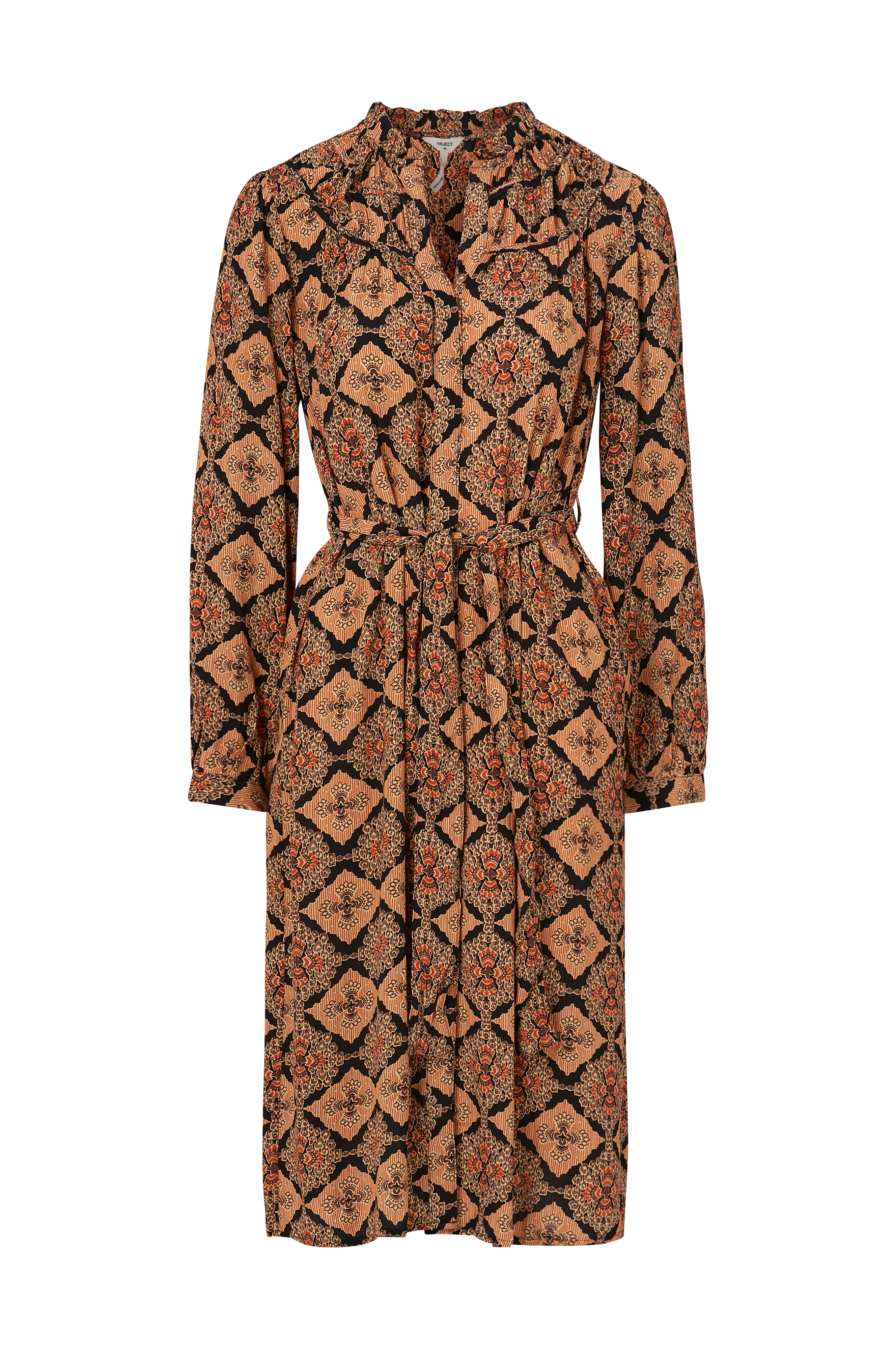 Object objLisa L/S Shirt Dress -paitamekko. Suora malli pehmeästi laskeutuvaa materiaalia. Rinnassa pyöristetty upotus, jossa poimutus ja drapeeraus. Pääntiessä pieni röyhelöreuna ja V-aukko edessä. Piilonapitus koko pituudelta edessä. Pitkät hihat, joissa poimutus olkapäällä ja kapea kalvosin hihansuissa. Vyötäröllä pienet vyölenkit ja solmimisvyö. Pituus n. 110 cm koossa 36.