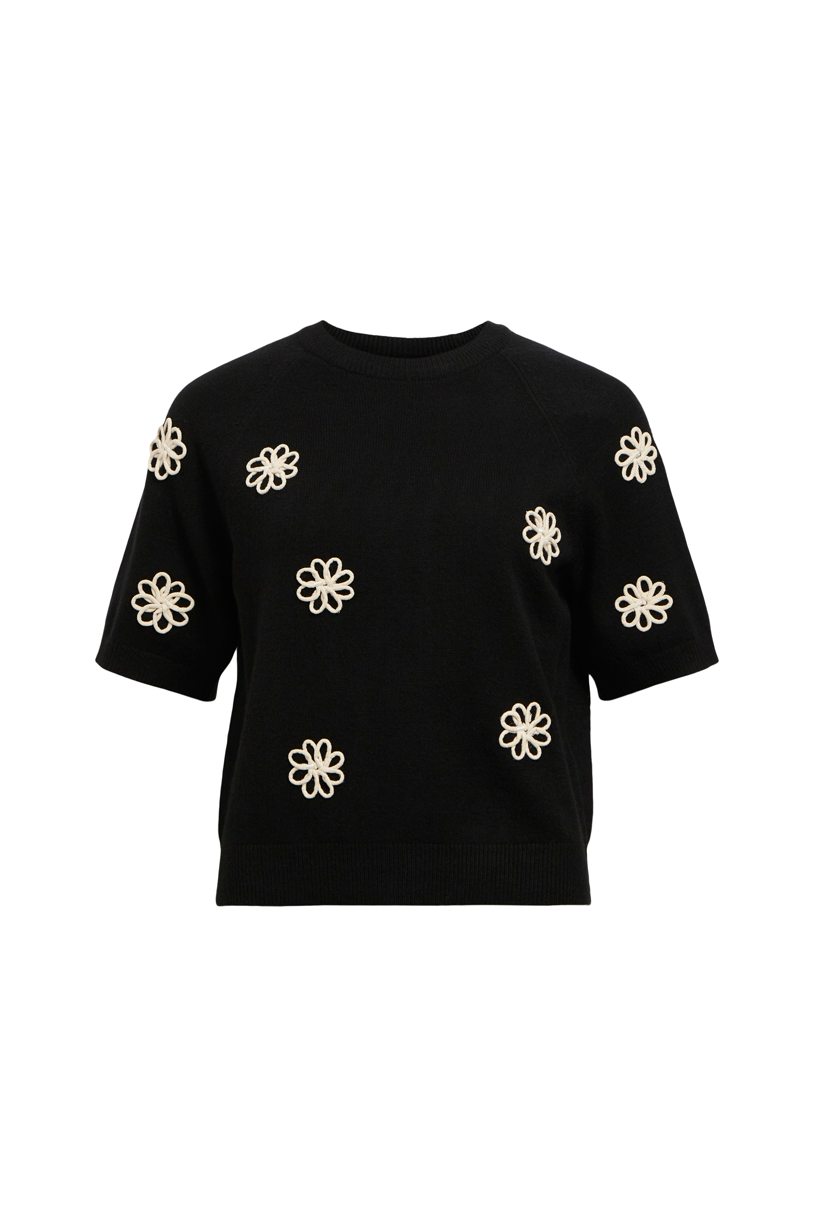 • Tiheäsilmukkainen pulloveri lyhyillä käsivarsilla ja kukkakirjailulla• Pyöreä kaula-aukko ribbineuloksella• Ribbineulos hihansuissa ja alhaalla• Normaali istuvuus