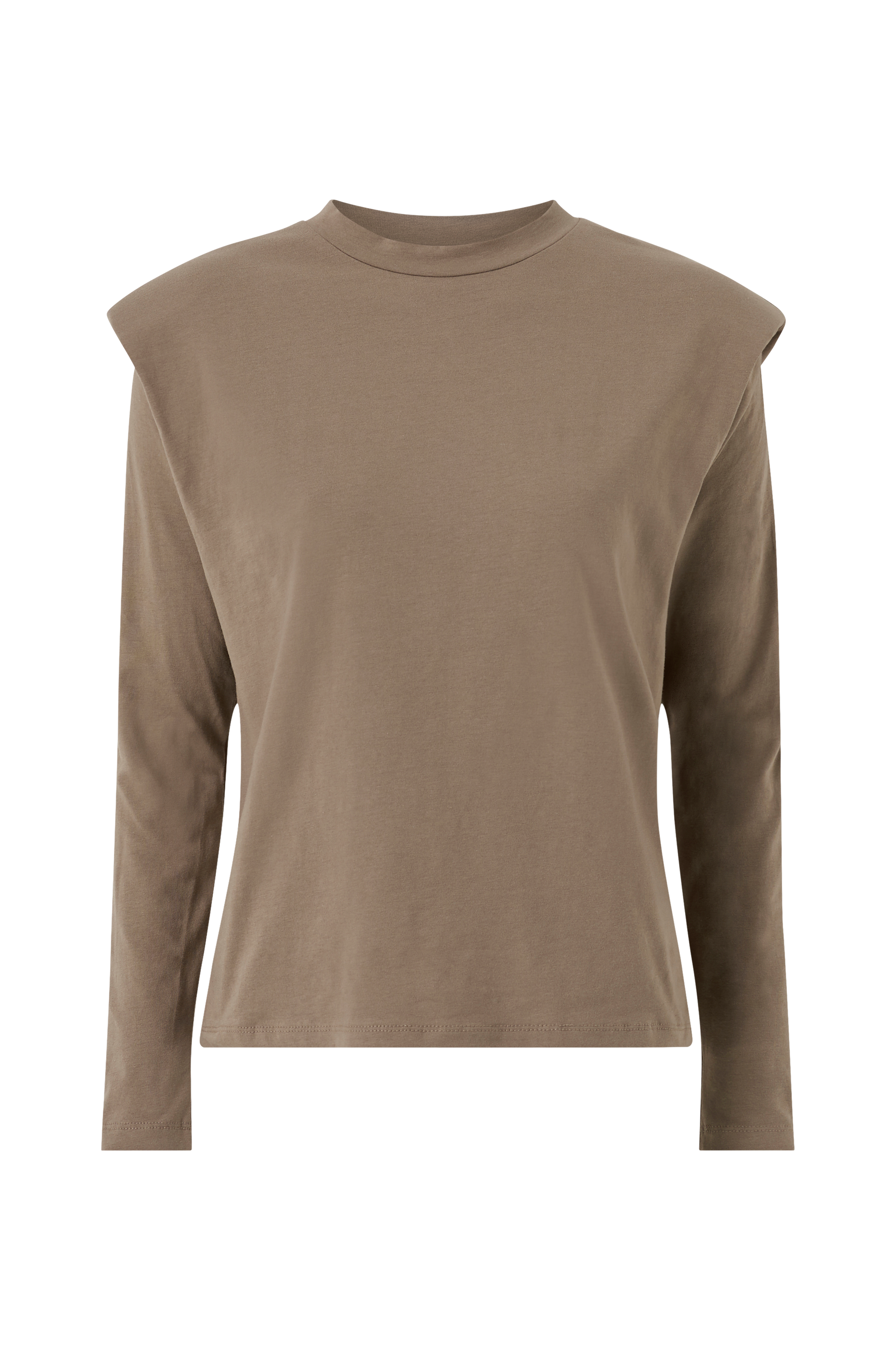 Pitkähihainen pusero puuvillatrikoota. Rento istuvuus ja korostetut olkapäät olkatoppauksin ja laskoksin. Pyöreä joustinneulospääntie.