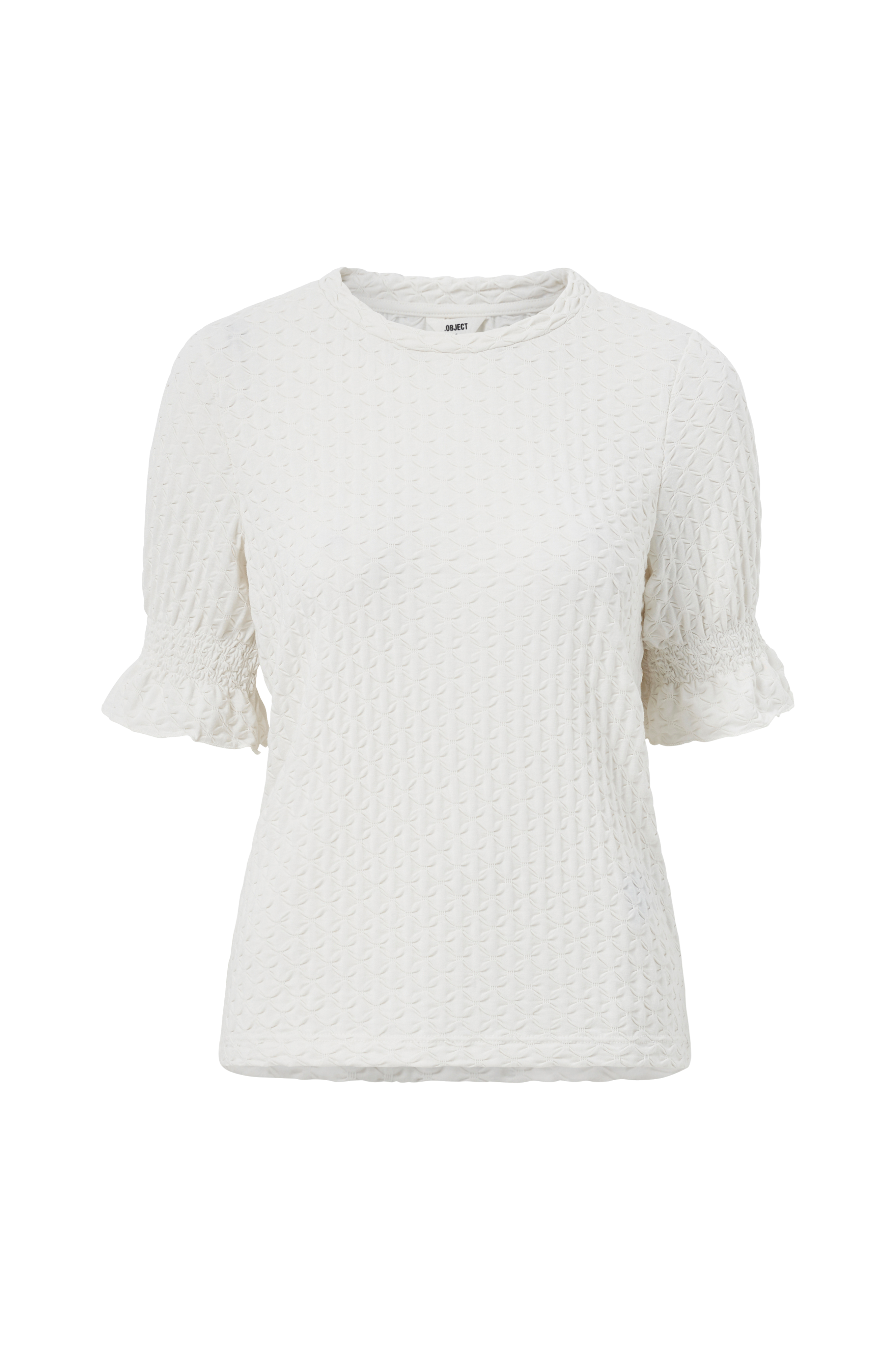 Pusero pintakuvioitua trikoota. Lyhyet hihat, joissa smokkirypytys ja röyhelö hihansuissa. Pyöreä pääntie.