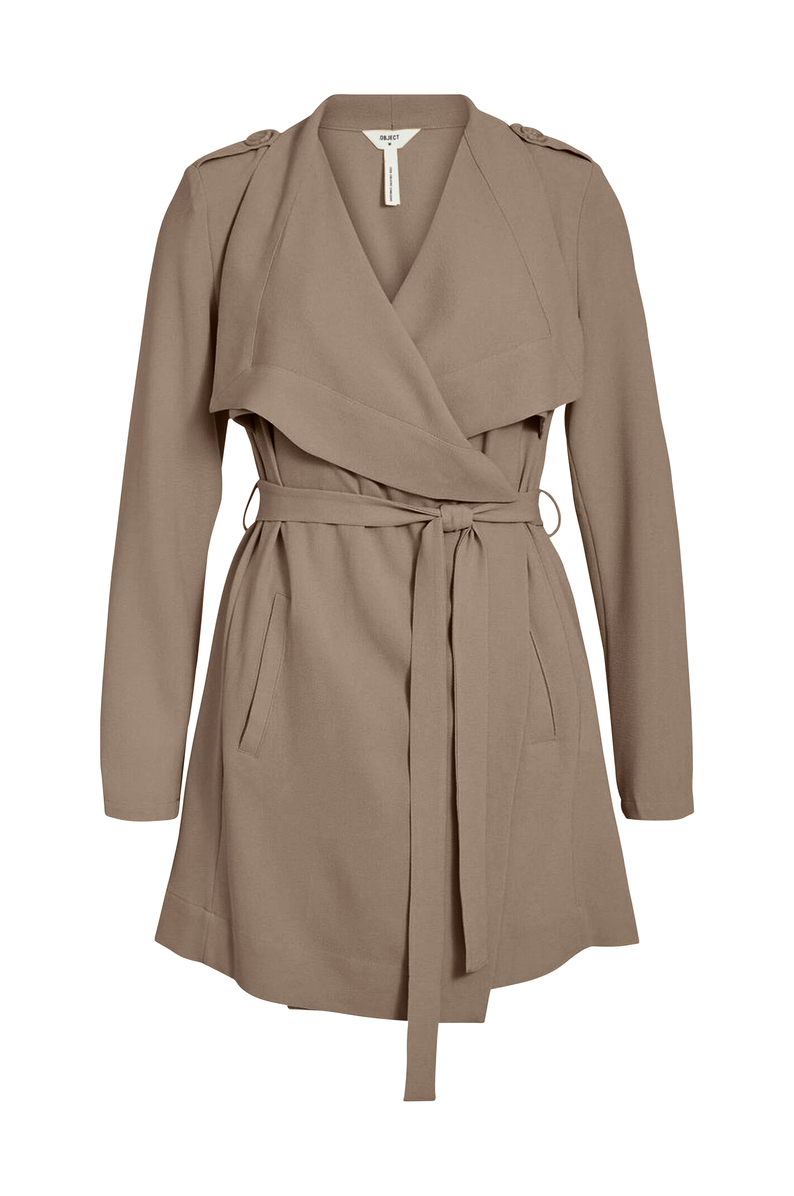 Object objAnnlee Short Jacket -takki. Tyylikäs vuoriton kietaisumalli, ei napitusta. Vyölenkit ja solmimisvyö vyötäröllä. Väljästi riippuva olkakaarroke edessä ja takana, olkaläpät ja sisäpuolella olkatoppaukset. Kaksi upotettua takataskua, joissa nappi. Pituus takaa n. 80 cm koossa S.
