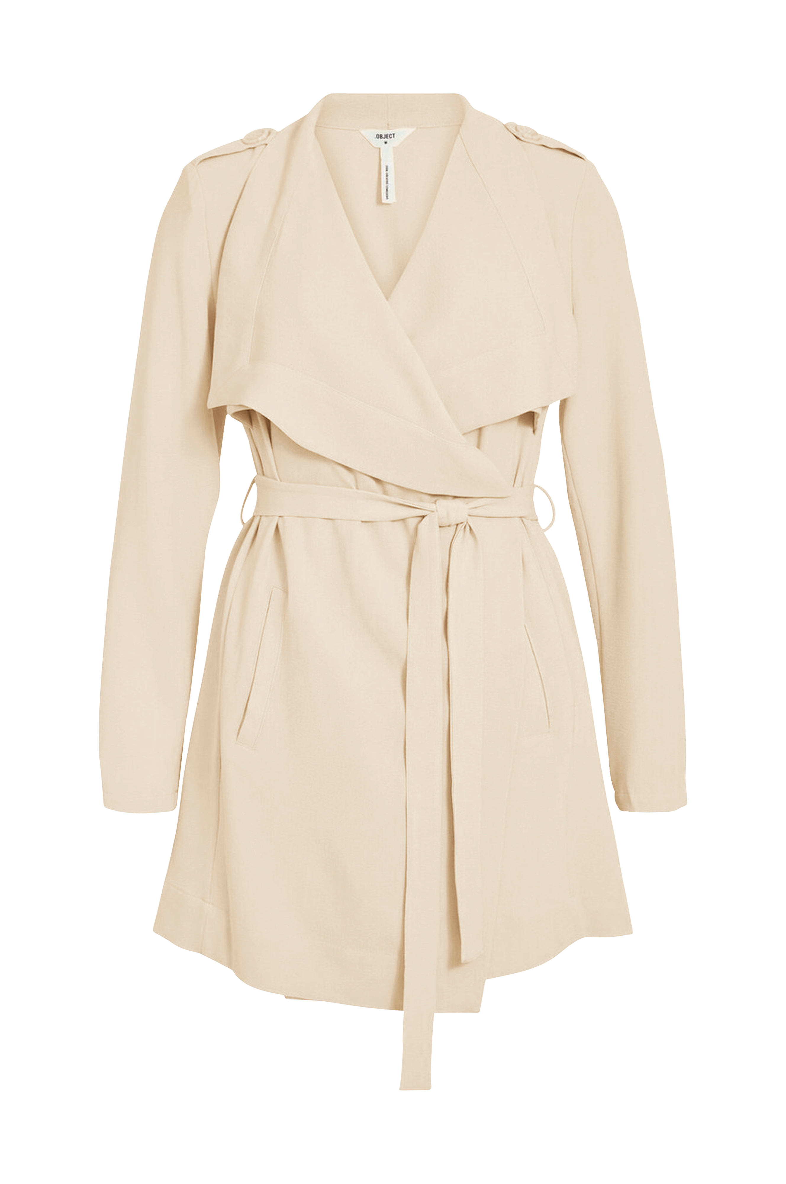 Object objAnnlee Short Jacket -takki. Tyylikäs vuoriton kietaisumalli, ei napitusta. Vyölenkit ja solmimisvyö vyötäröllä. Väljästi riippuva olkakaarroke edessä ja takana, olkaläpät ja sisäpuolella olkatoppaukset. Kaksi upotettua takataskua, joissa nappi. Pituus takaa n. 80 cm koossa S.