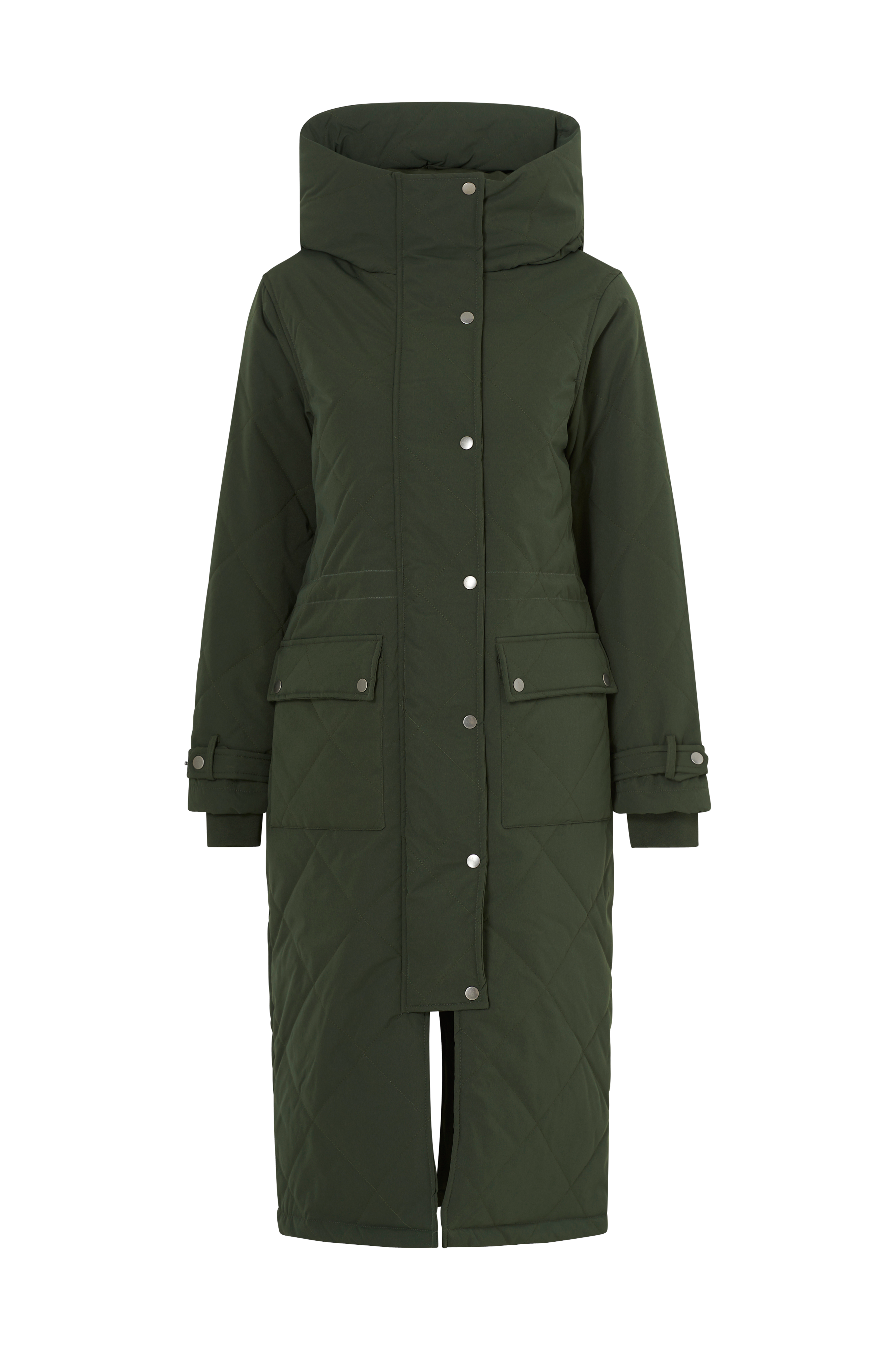 Lämmin hupullinen toppatakki. Kaksisuuntainen vetoketju, tuulisuojalista ja painonapit. Vyötärön sisäpuolella nyöri. Hihansuissa säädettävä leveys ja resorit. Kaksi taskua, joissa napillinen kansi. Napillinen halkio helmassa takana. Pituus n. 118 cm koossa 36.
