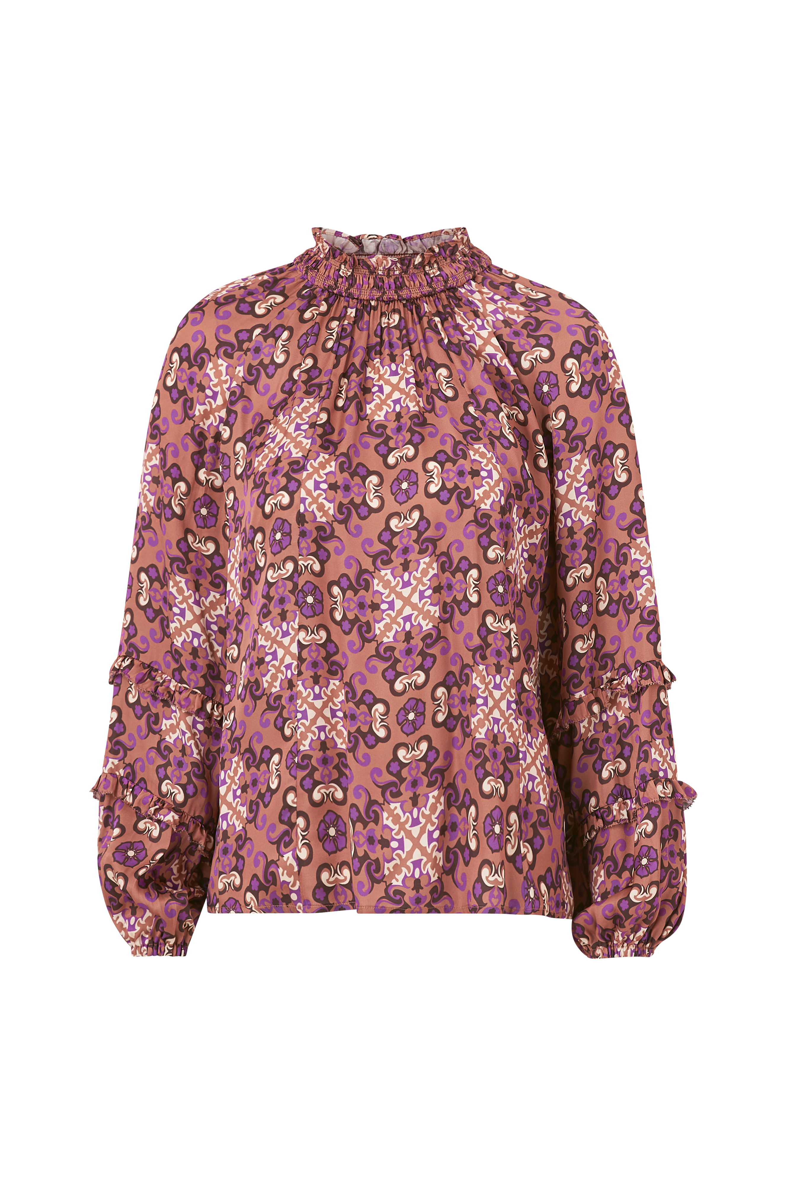 Odd Molly Georgine Blouse -paita. Väljä ja suora oversize-malli satiinia. Pyöreä pääntie, jossa poimutus ympäriinsä. Puolikorkea smokkirypytetty kaulus. Väljät raglanhihat, joissa päälleommellut röyhelöt ja upotettu kuminauha hihansuissa.