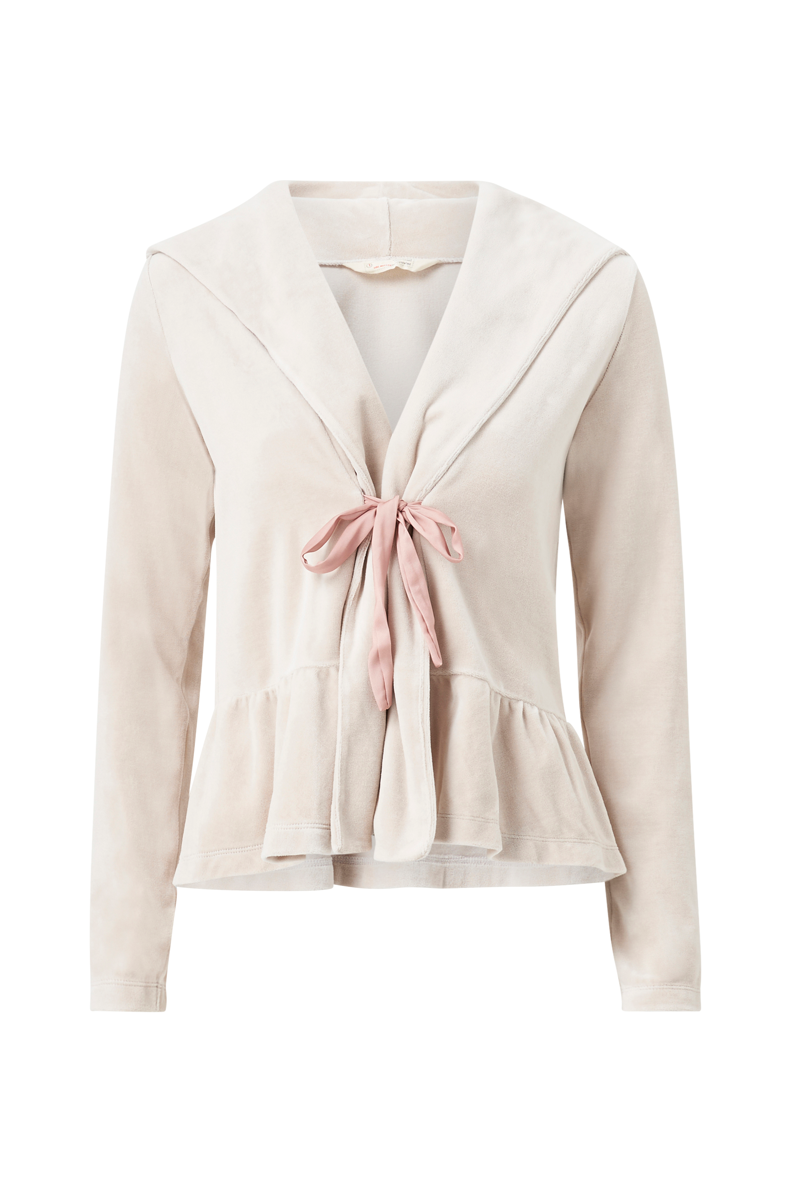 Pehmeä plyysitakki, jossa saalikaulus ja iso vuorillinen huppu. Kietaisumalli solmitaan rinnasta satiininauhoilla. Helmassa päälleommeltu röyhelö.