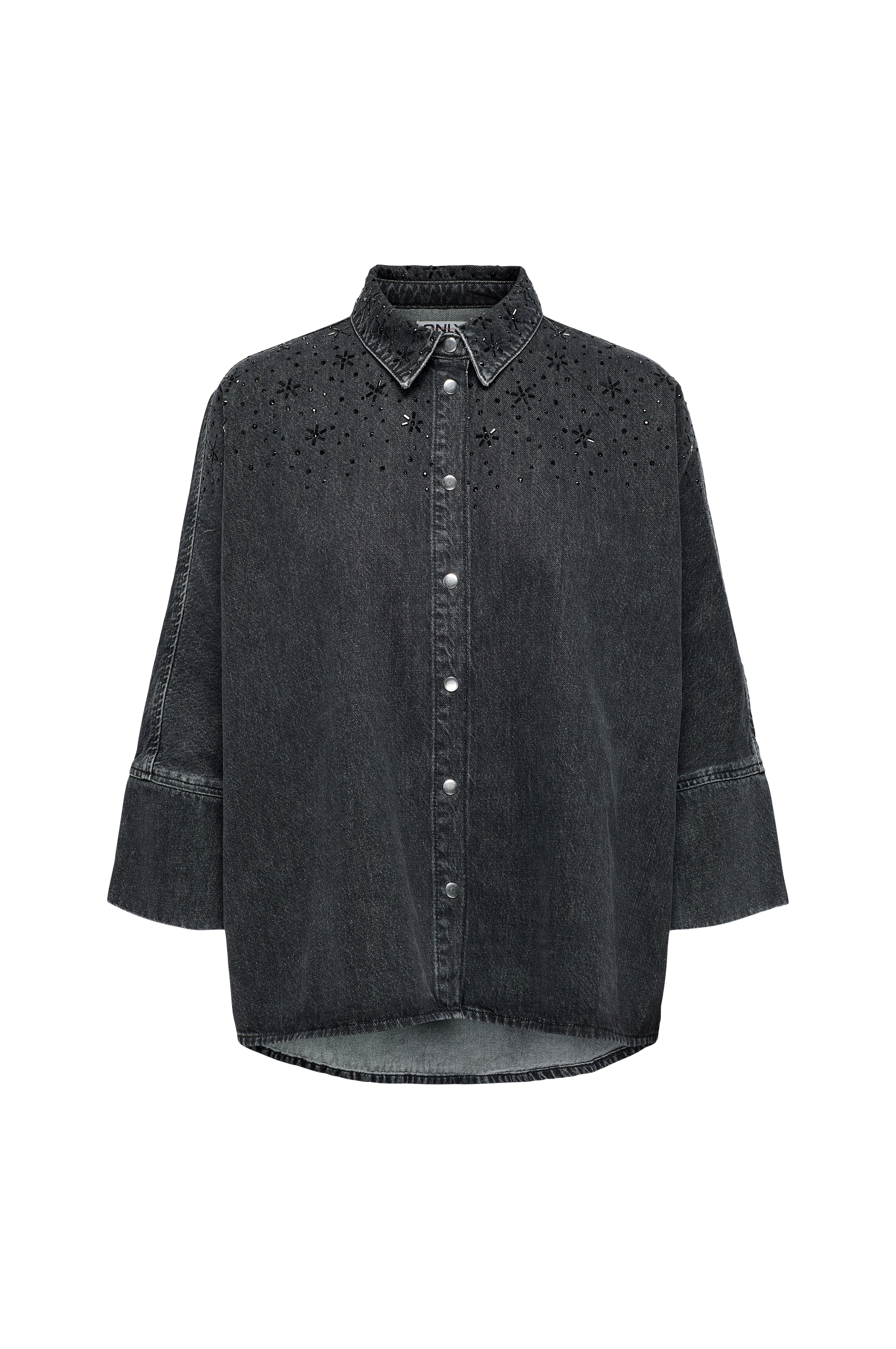 • Plus-koot• Leveä, suora malli• Hopeanväriset nepparit• Kimaltelevat, pienet kivet ylhäällä• Leveät, 3/4-pituiset kimonohihat• Pyöristetty helma