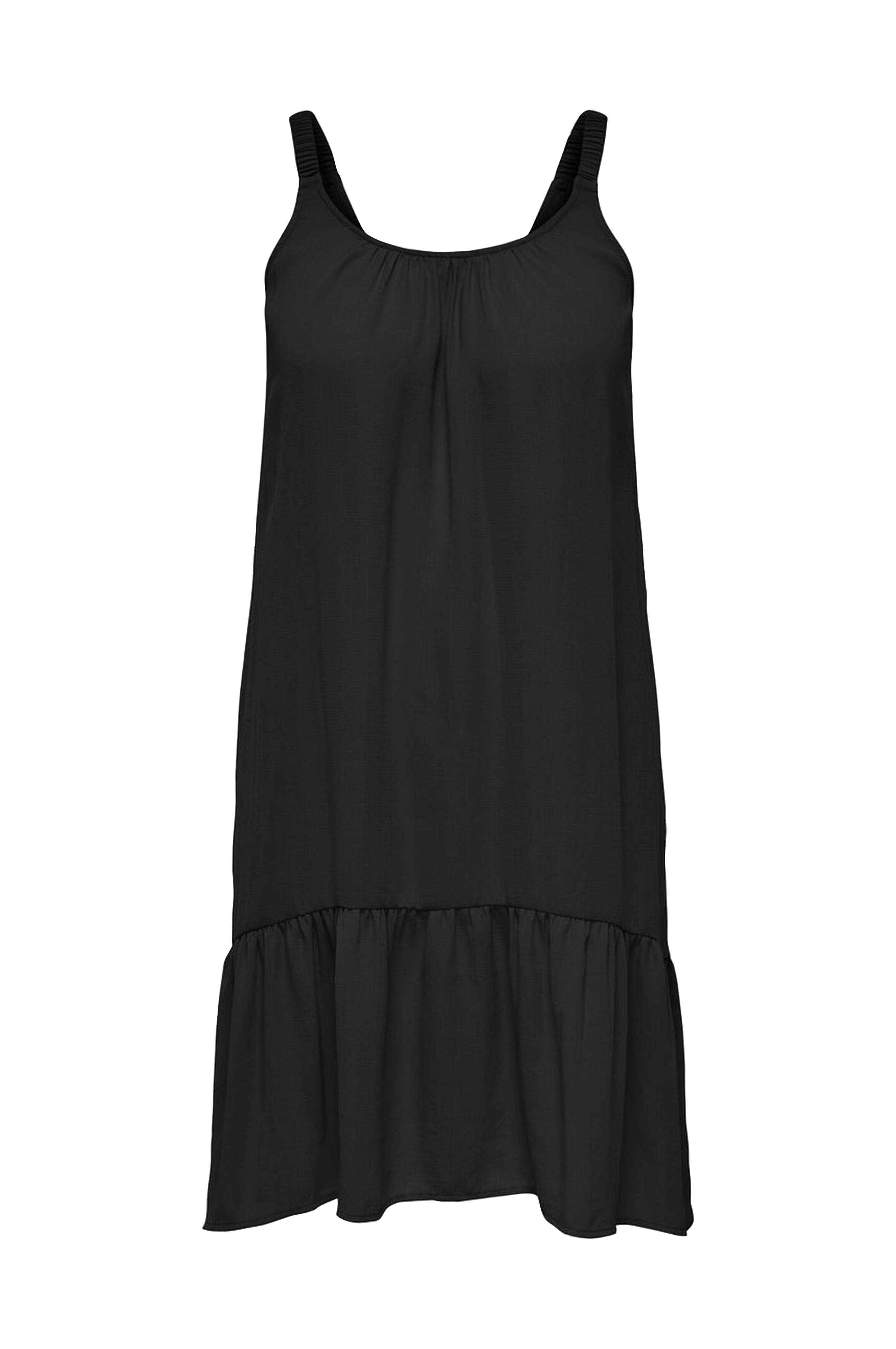 • Pohkeen puoliväliin ulottuva, hihaton malli• Pyöreä, poimutettu kaula-aukko• Röyhelö alhaalla• Elastiset, poimutetut olkaimet• Pituus: 104 cm koossa 44