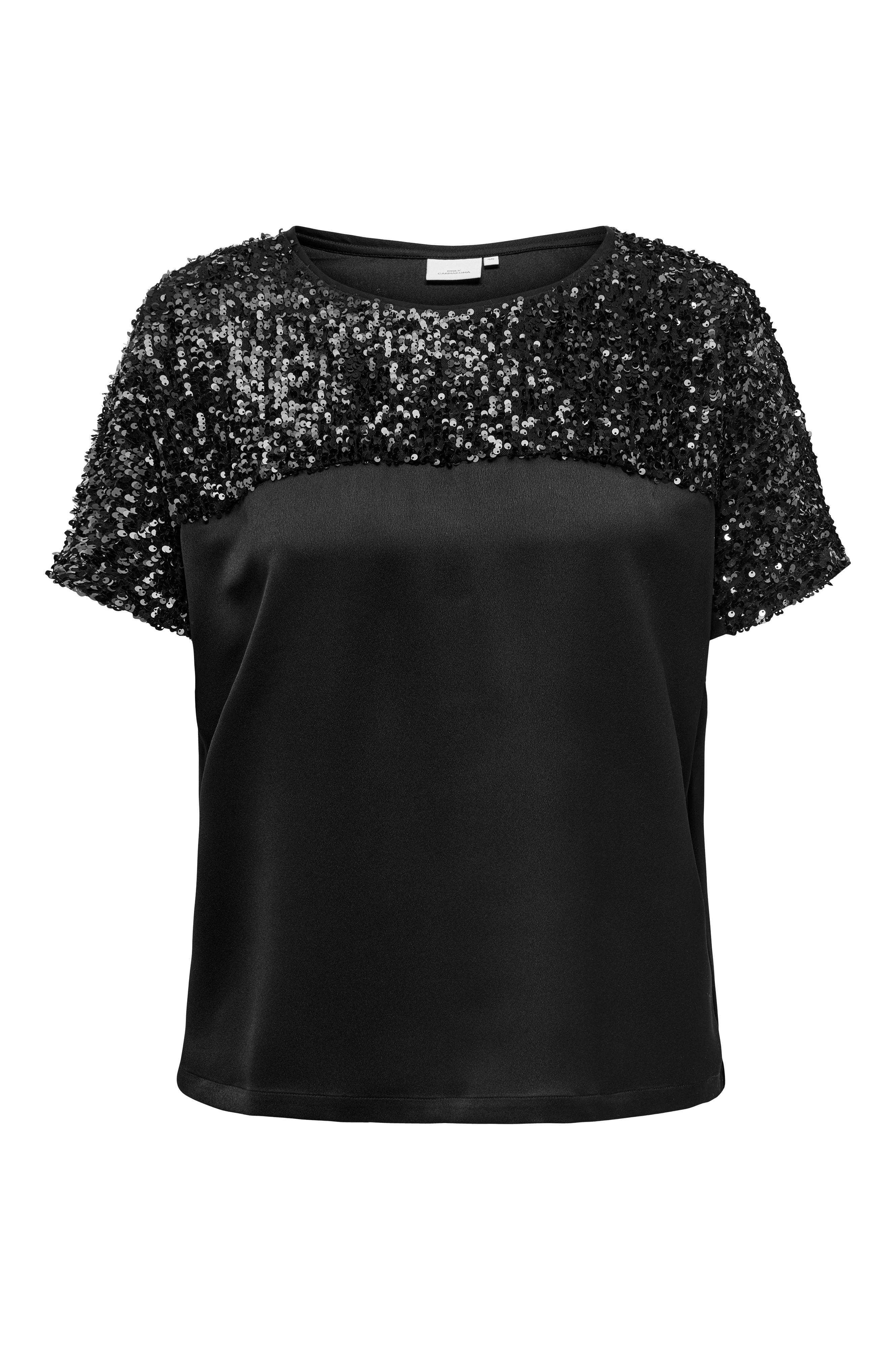 • Lyhythihainen pusero paljeteilla ympärillä ylhäällä• Veneen muotoinen kaula-aukko• Plus-koot