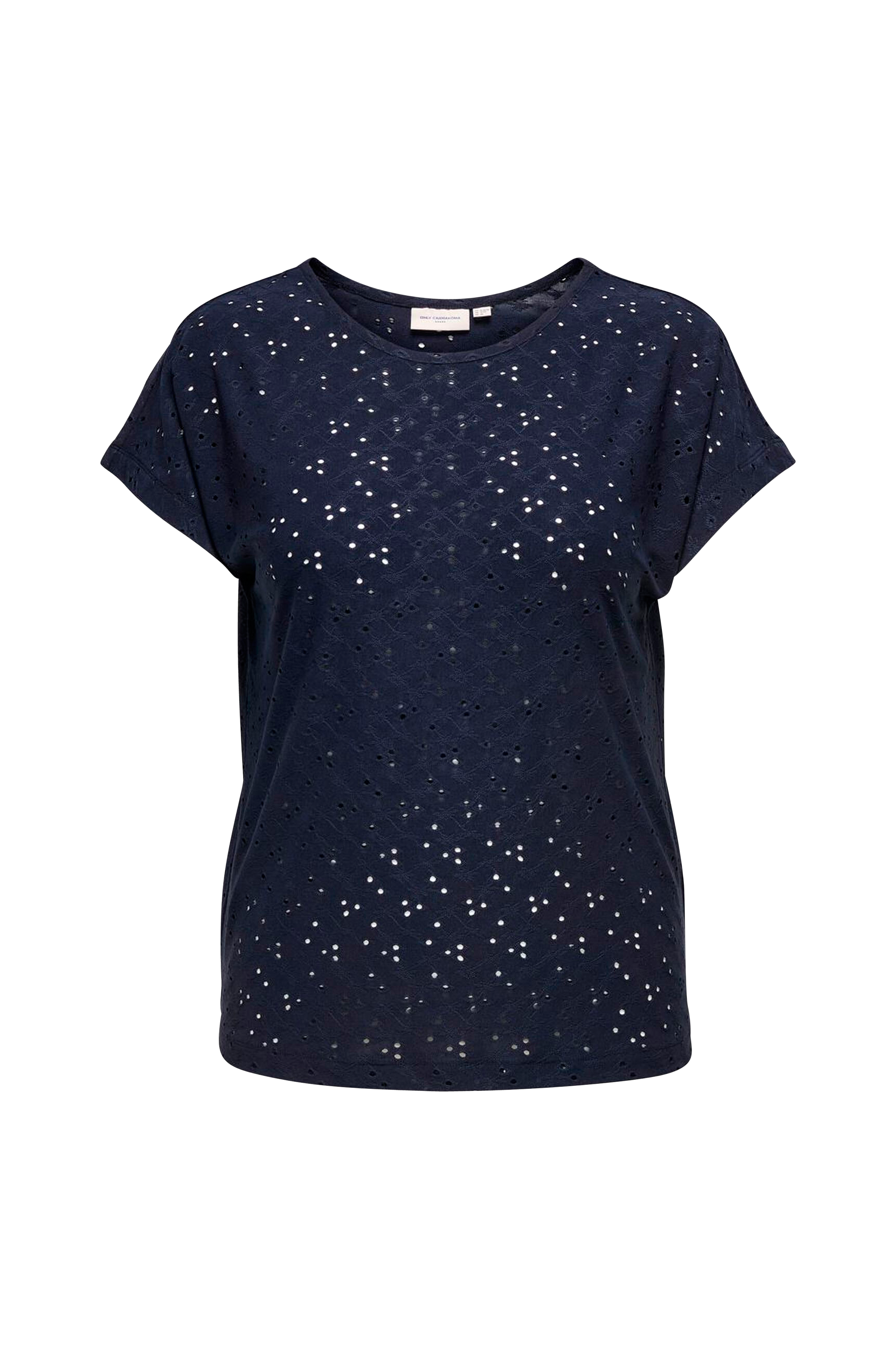Lyhythihainen toppi venyvästä trikoosta pyöreällä kaula-aukolla. Reikäkuviointi kaikkialla.