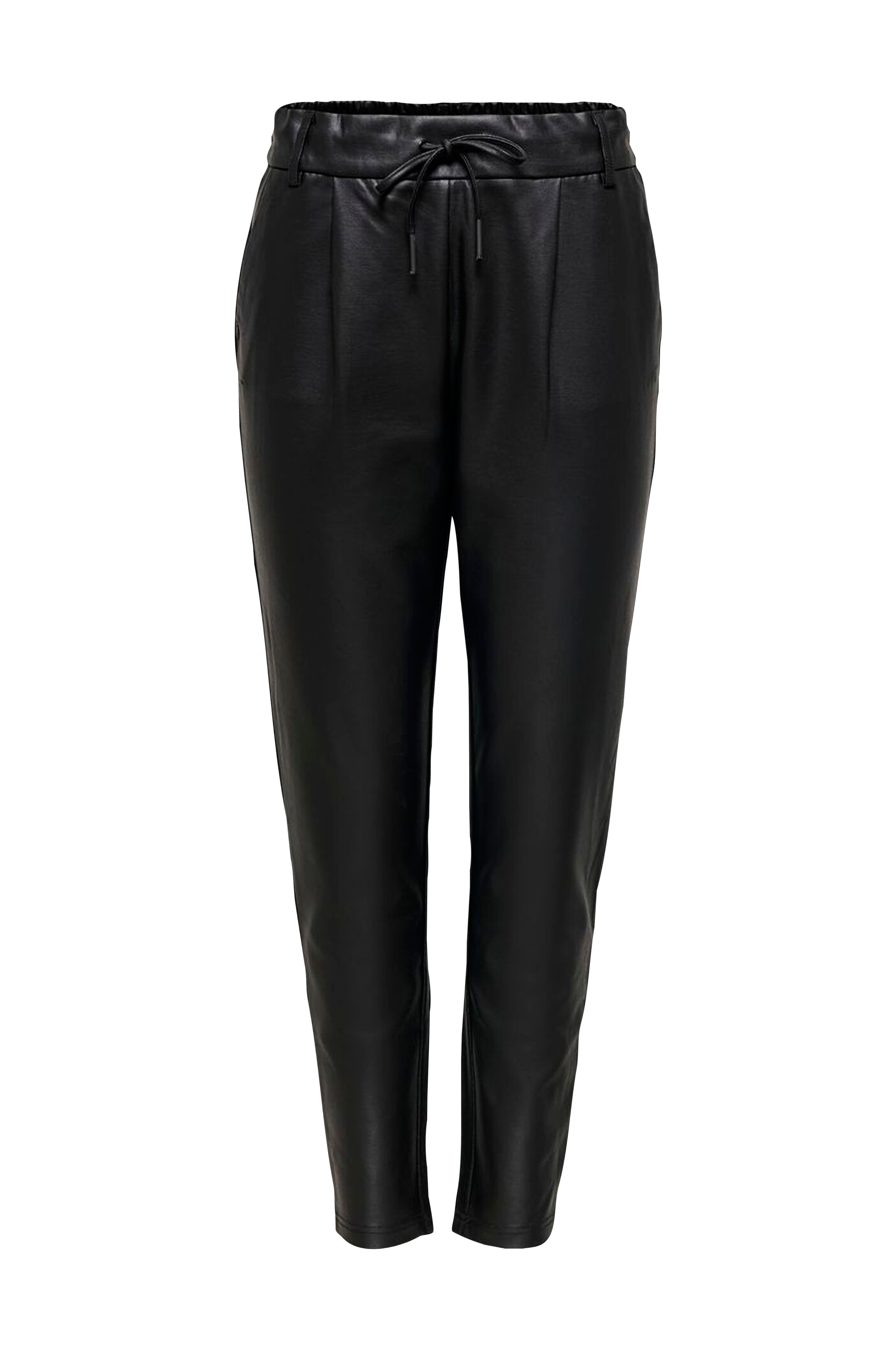 Only onlPoptrash Easy Coated Pant -housut. Myötäilevää nahkajäljitelmää, väljät reidet ja kevyesti kapenevat lahkeensuut. Korkea vyötärö ja päälleommeltu vyötärönauha, jossa vyölenkit, takana upotettu kuminauha ja edessä solmittava nyöri. Kaksi viistoa etutaskua ja kaksi upotettua valetakataskua. Lahkeen sisäpituus n. 64 cm koossa S.