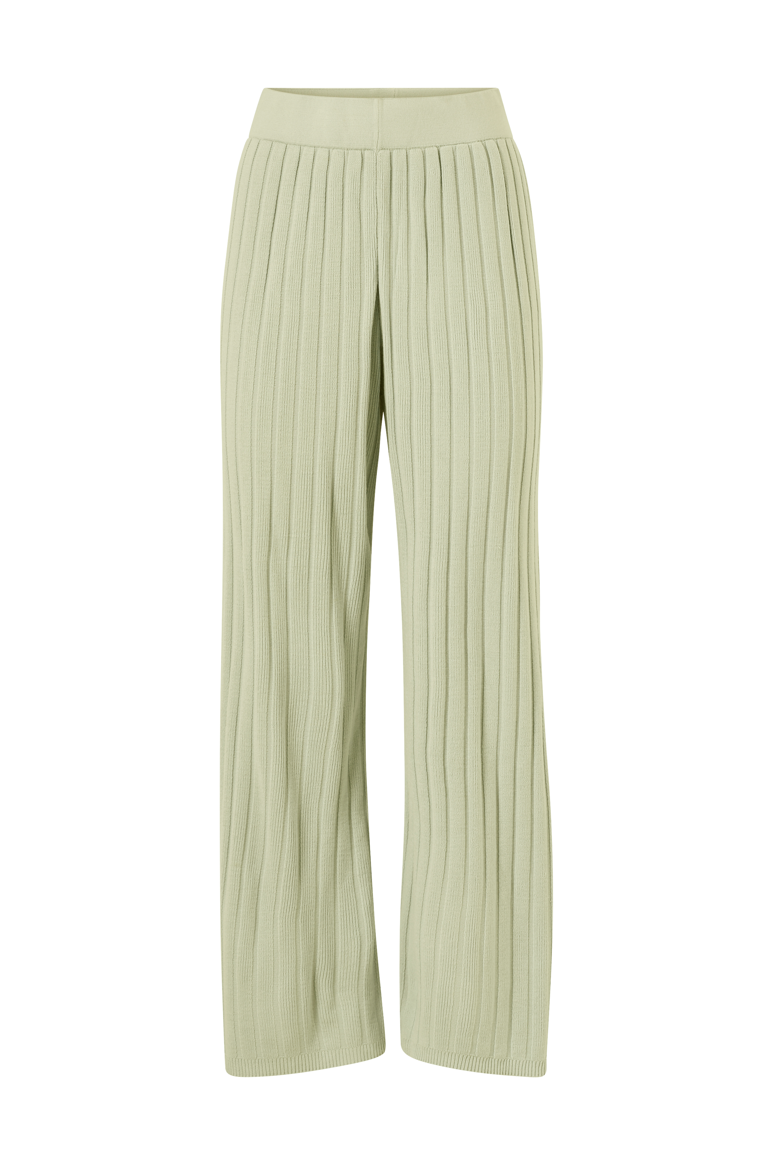 Leveät joustinneulehousut, joissa leveä kuminauha vyötäröllä. Lahkeen sisäpituus n. 71 cm koossa S.