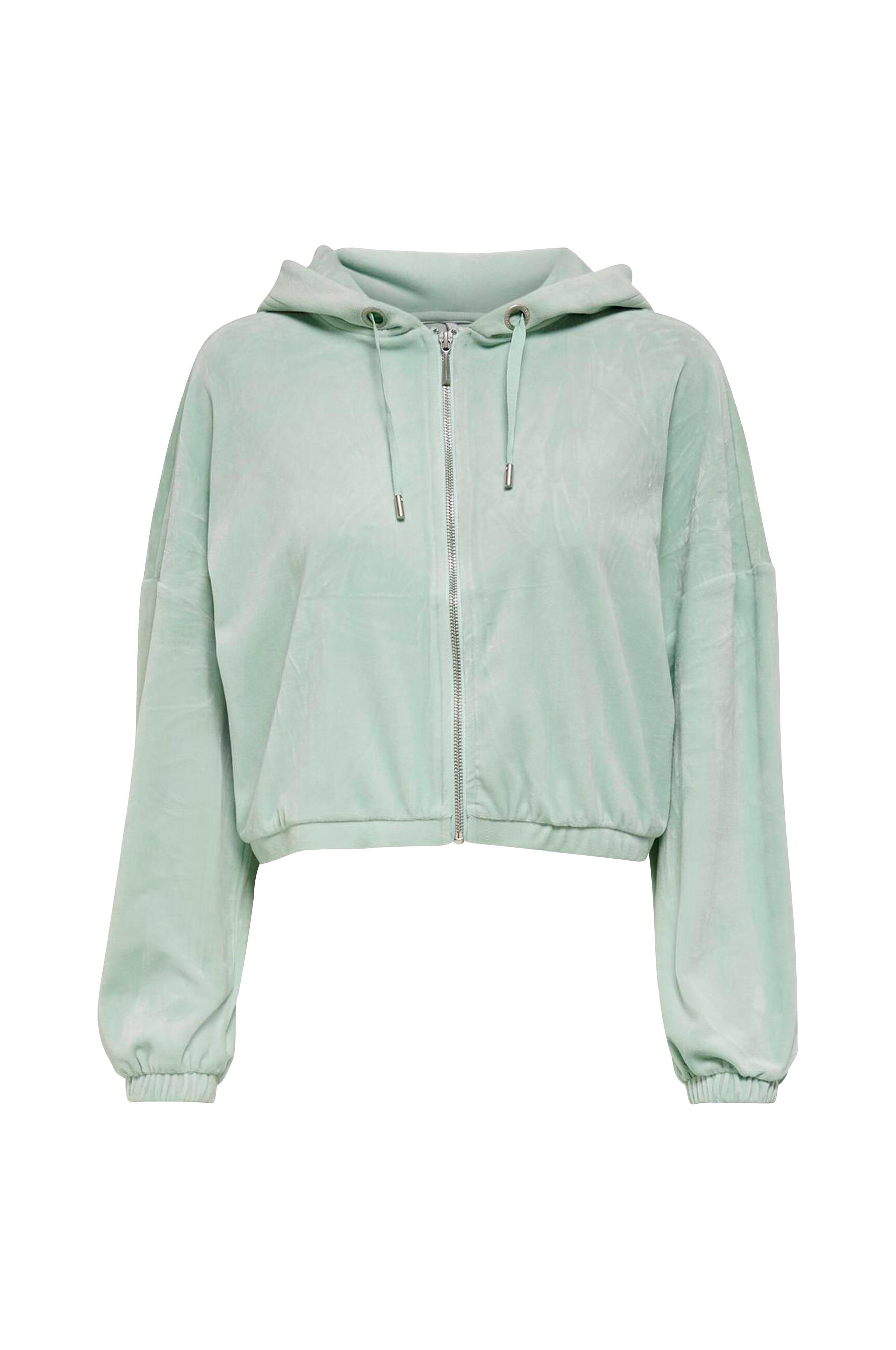 Huppari pehmeää veluuria. Lyhyt malli, jossa vetoketju edessä ja nyörillinen huppu. Pitkät hihat, joustavat hihansuut ja madalletut olkapäät.
