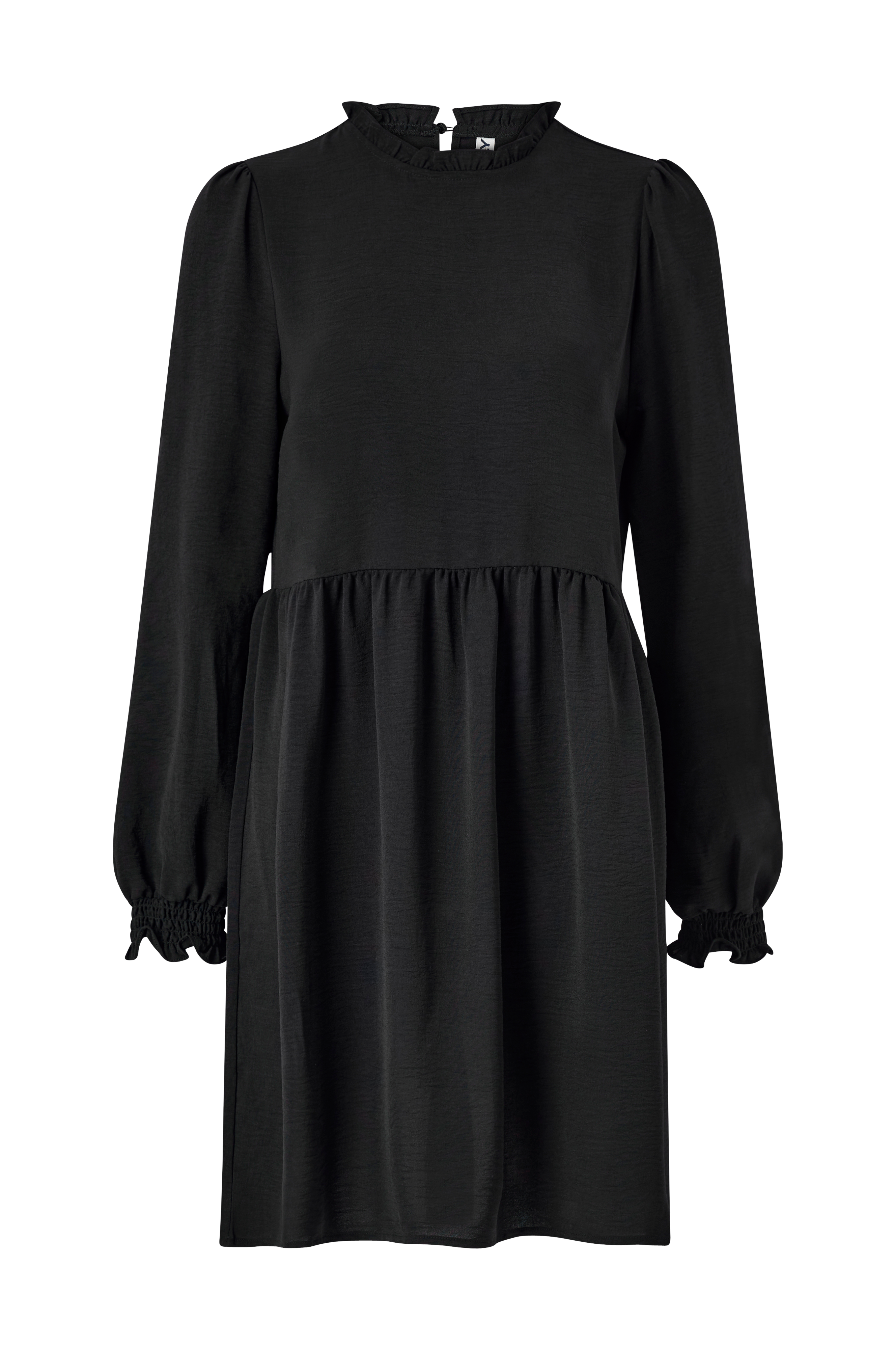 • Korkea kaula-aukko röyhelöllä • Halkio napilla niskan kohdalla • Pitkät hihat rypytyksellä hihansuissa • Poimutettu vyötärö • Pituus: 90 cm koossa S • Tuote sisältää kierrätettyä materiaalia, jonka käyttö vähentää jätteen määrää ja säästää luonnonvaroja.