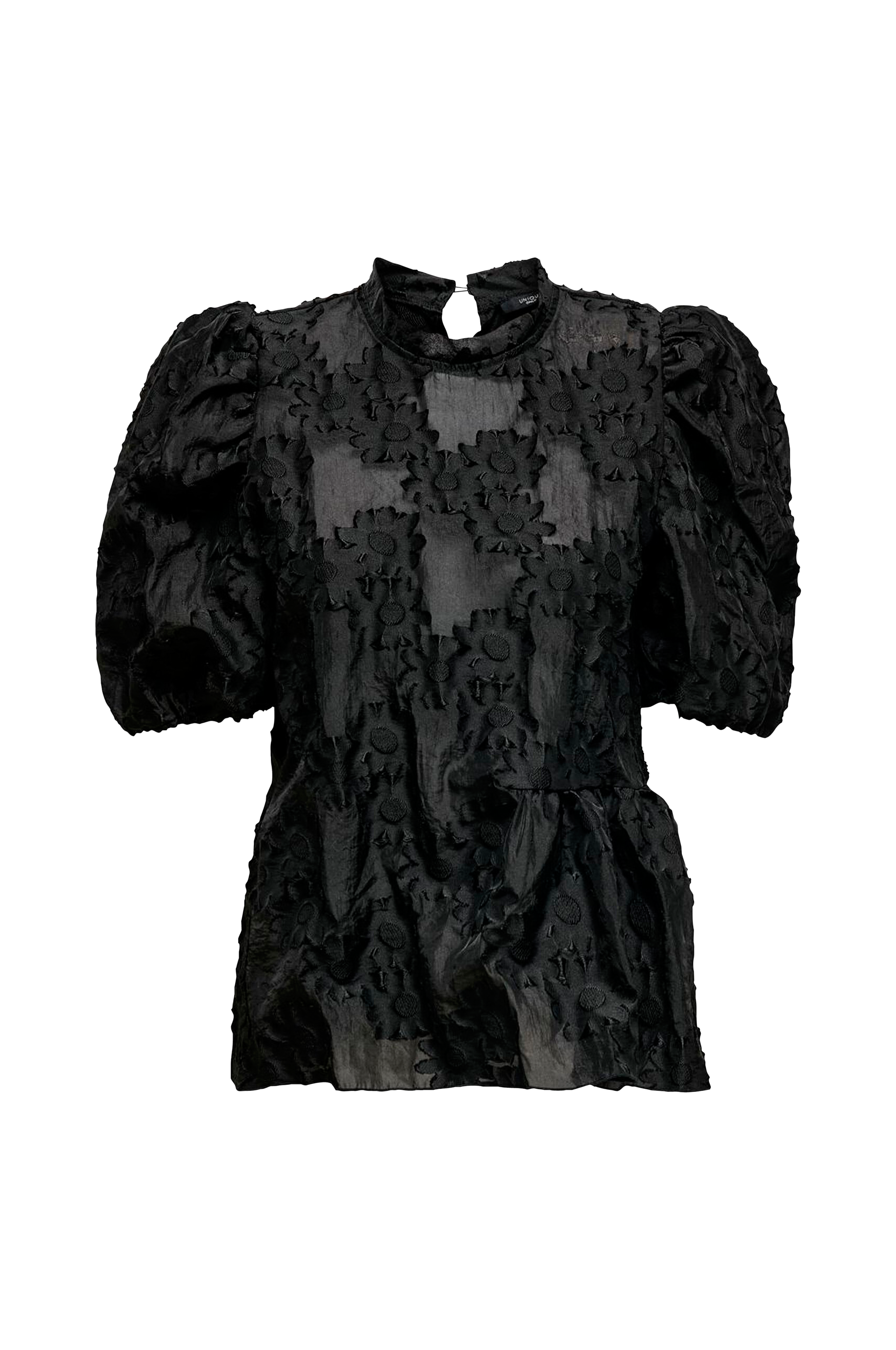 OnqSierra S/S Top Wvn -paita napakkaa, organzamaista ja kauniisti hohtavaa materiaalia. Kohokukkia kauttaaltaan. Koristepoimutettu sauma toisella sivulla. Lyhyet, runsaat puhvihihat, joissa joustavat hihansuut. Syvä halkio ja nappi selässä. Hieman läpikuultava.