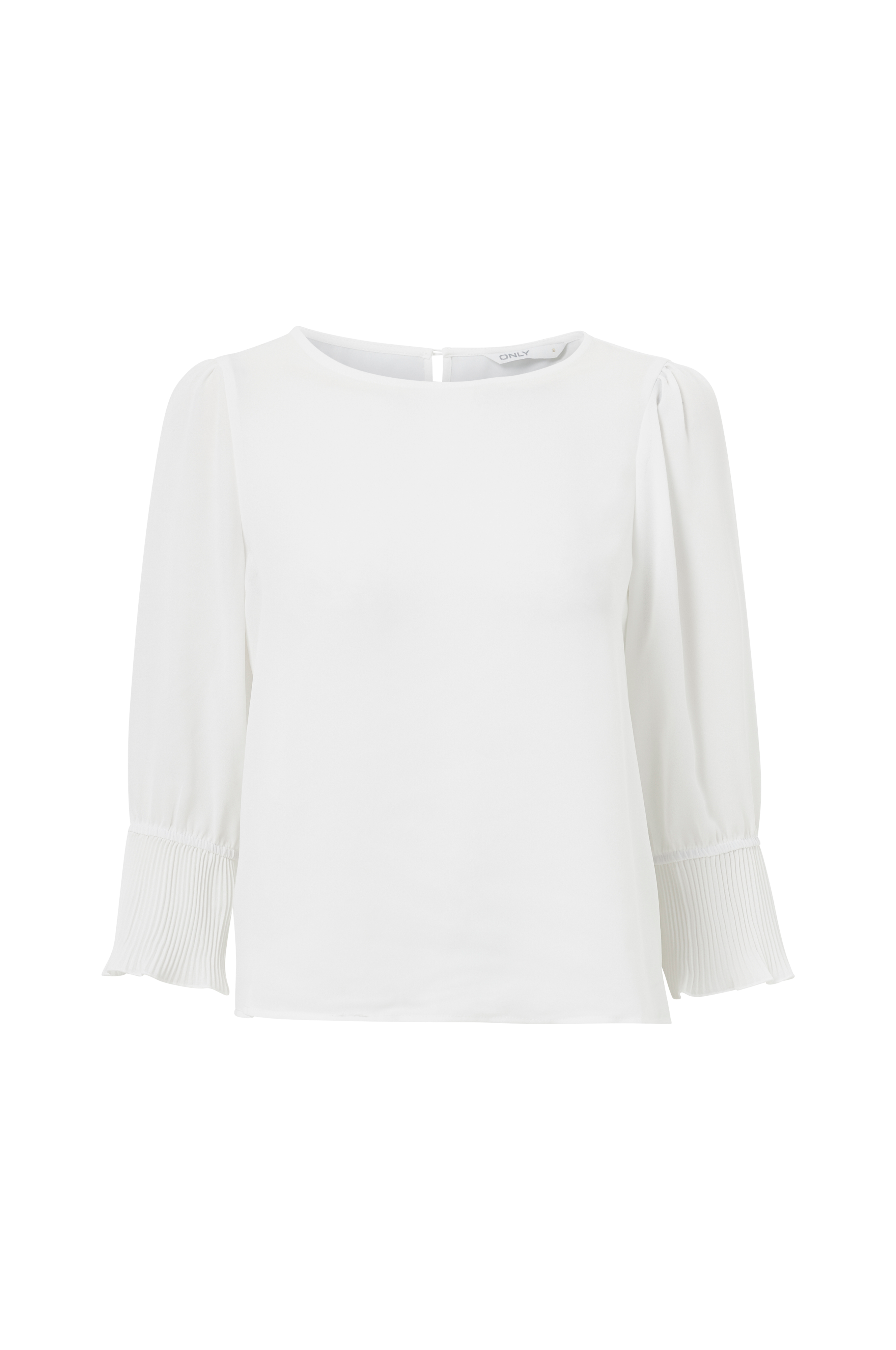 Suora oversize-malli kreppisifonkia. Avarahko pääntie, jossa halkio ja nappi niskassa. Leveät 3/4-pituiset hihat, joissa poimutus olkapäillä ja leveä, pliseerattu upotus hihansuissa.