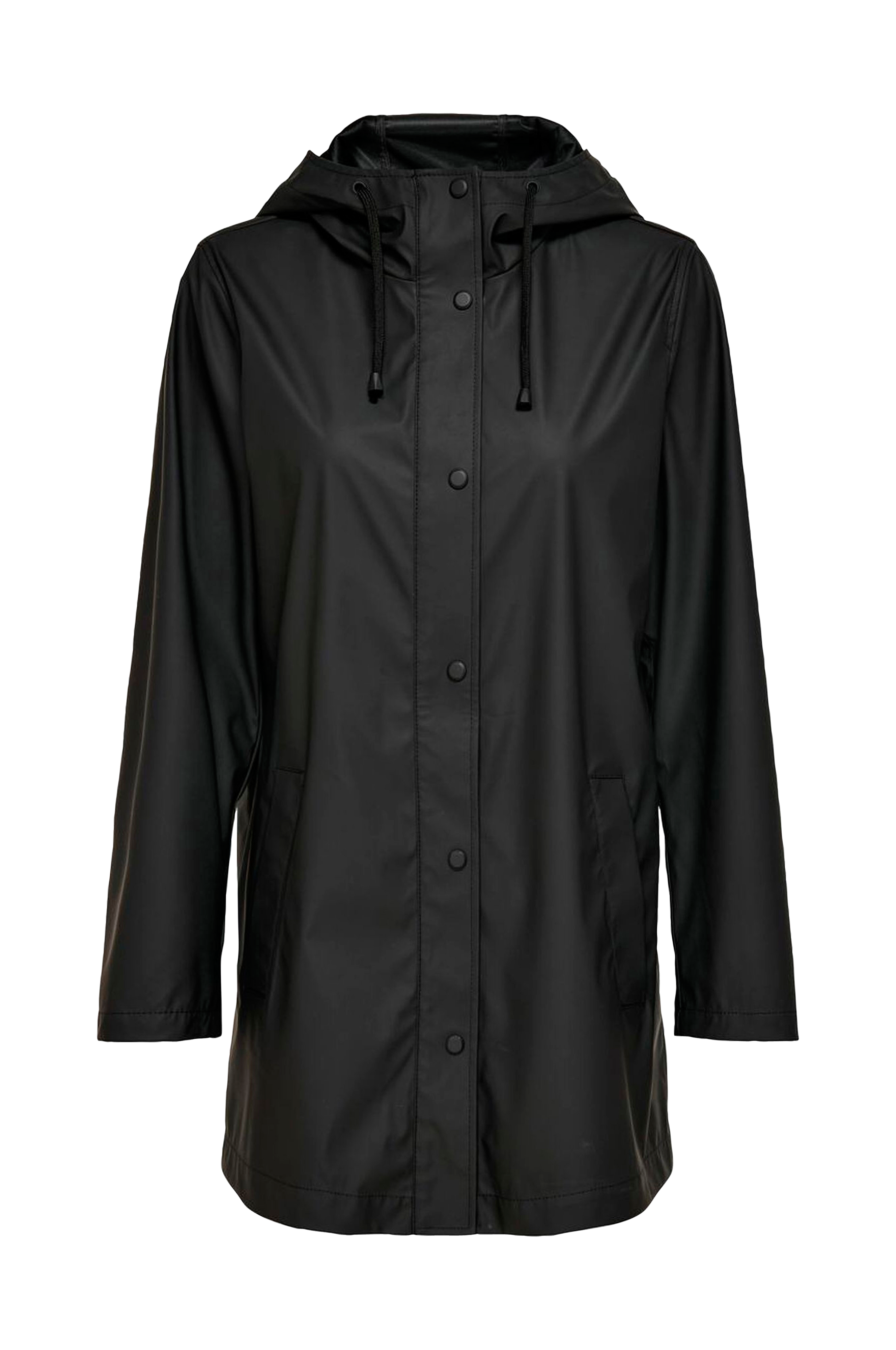 Suora malli, painonapit edessä ja korkea kaulus. Hupussa nyöri ja kaksi upotettua taskua. Pituus n. 81 cm koossa S.