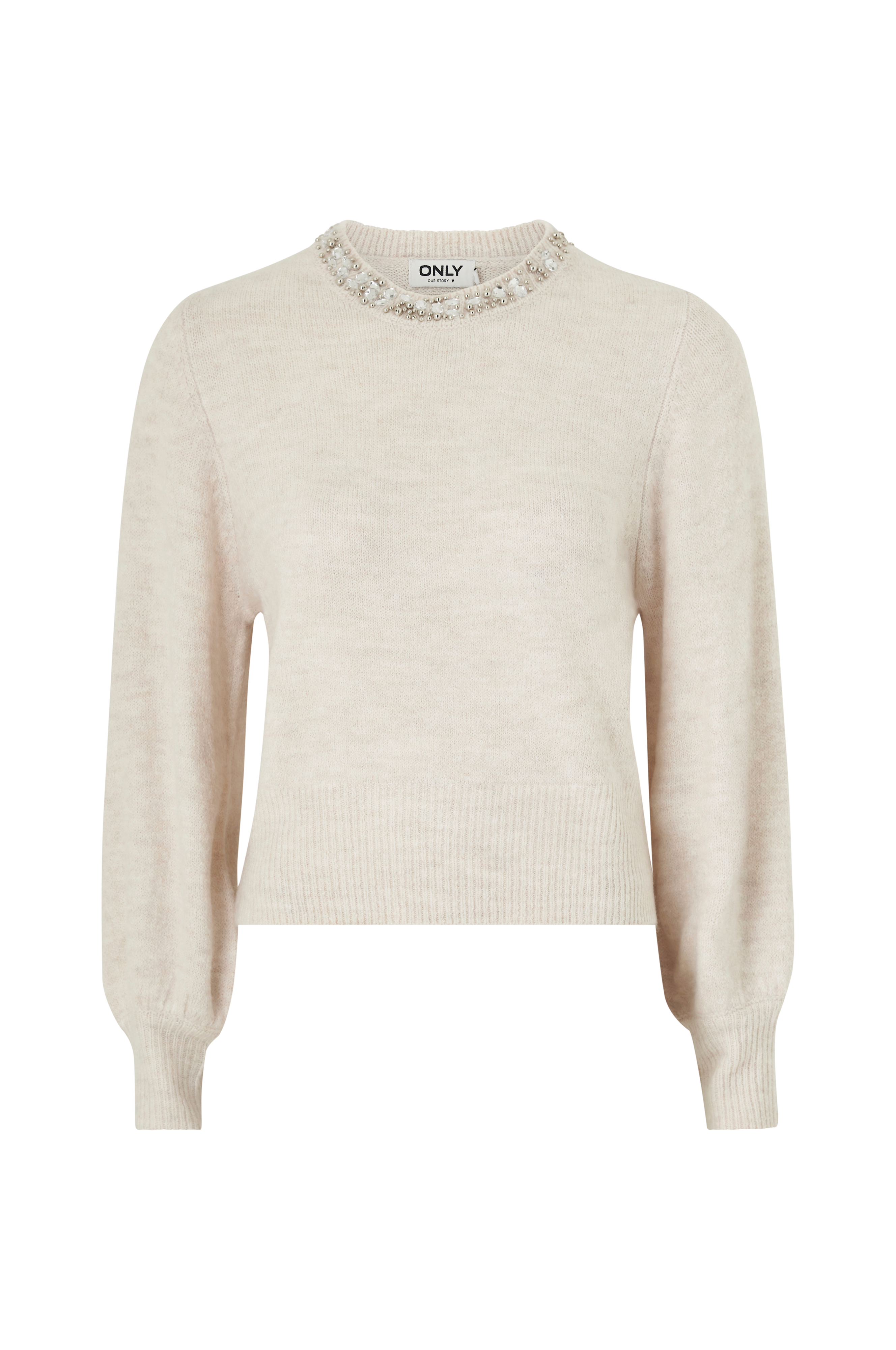 • Tiheäsilmukkainen malli• Pyöreä pääntie kirjaillulla tekojalokivellä ja helmillä edessä• Pitkä, leveä hiha• Leveä ribbineulos hihansuissa ja alhaalla