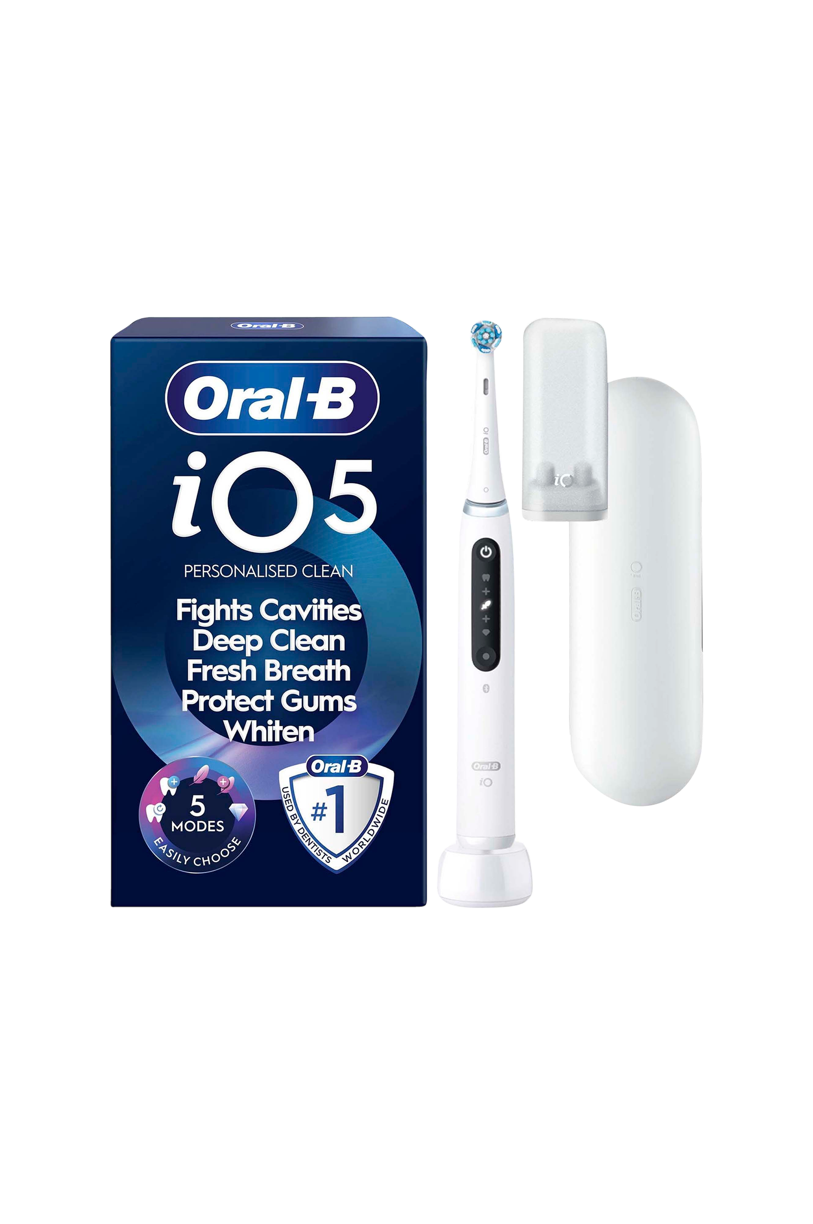 • Oral-B iO 5 -hammasharja tarjoaa edistyksellisen puhdistuksen hellävaraisilla mikrovärähtelyillä ja pyöreällä harjanpäällä.