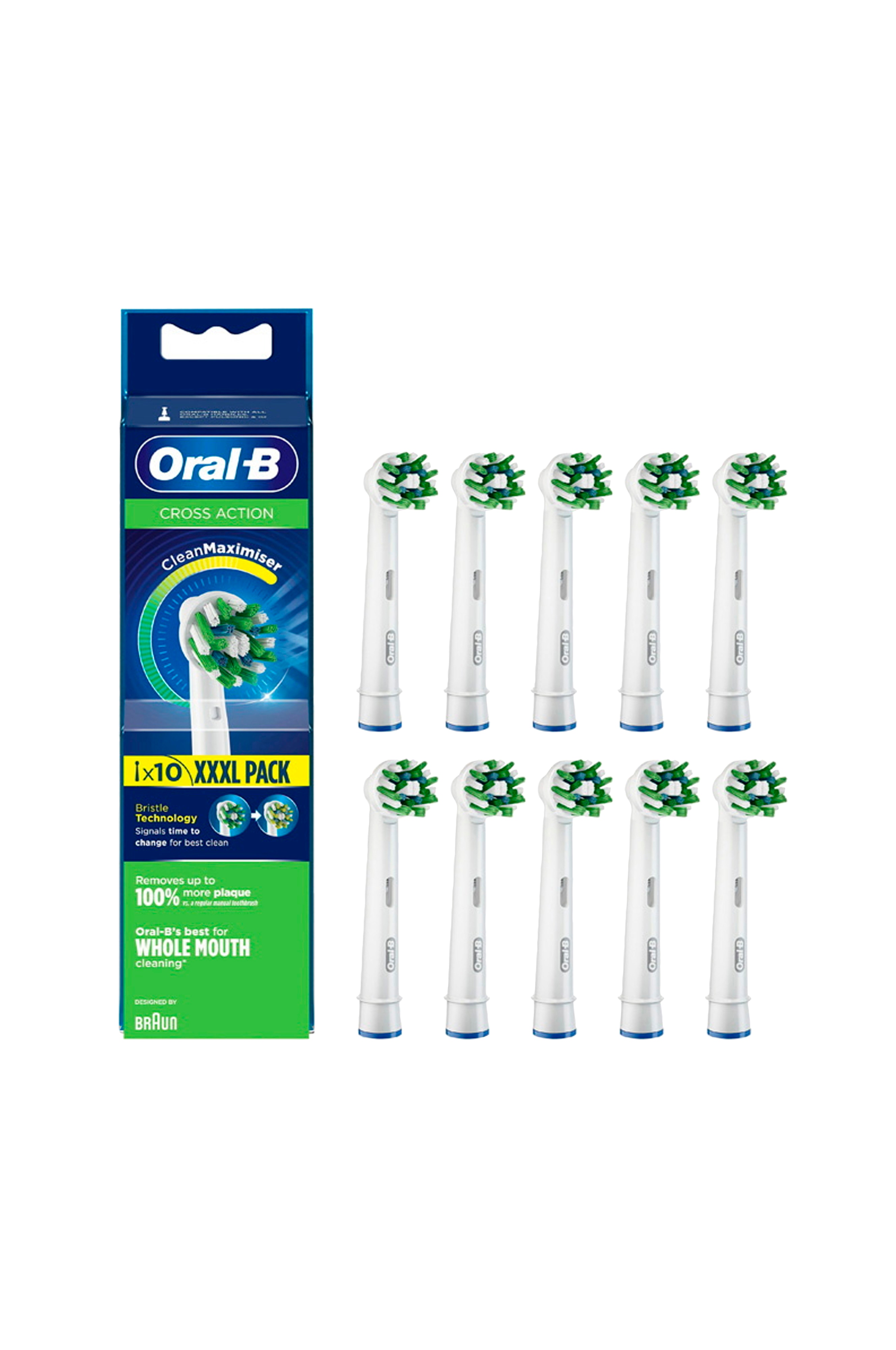 Oral-B:n paranneltujen CrossAction-harjaspäiden CleanMaximiser-teknologia saa harjakset vaihtamaan väriä vihreästä keltaiseen, millä varmistetaan harjaspään optimaalinen suorituskyky ja mahdollisimman hyvä puhdistus. Ainutlaatuiset harjakset ulottuvat syvälle hampaiden väleihin, poistavat plakkia ja jättävät koko suun puhtaammaksi kuin tavallinen käsikäyttöinen hammasharja.