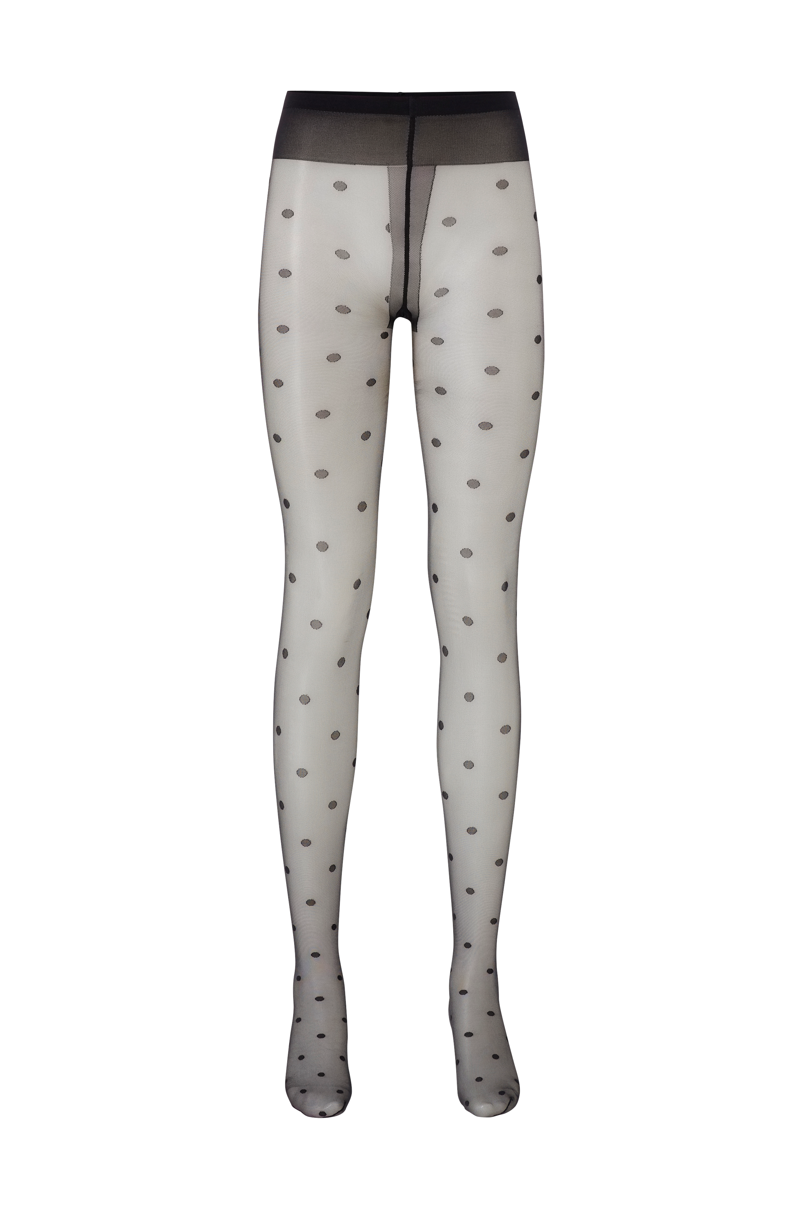 Ohuet sukkahousut pehmeää ja kestävää pilkullista polyamidisekoitetta. Pehmeä ja mukava vyötärö ja litteät saumat, jotka eivät erotu vaatteiden alta. Huomaamaton kärki ja puuvillavuoritettu haara.