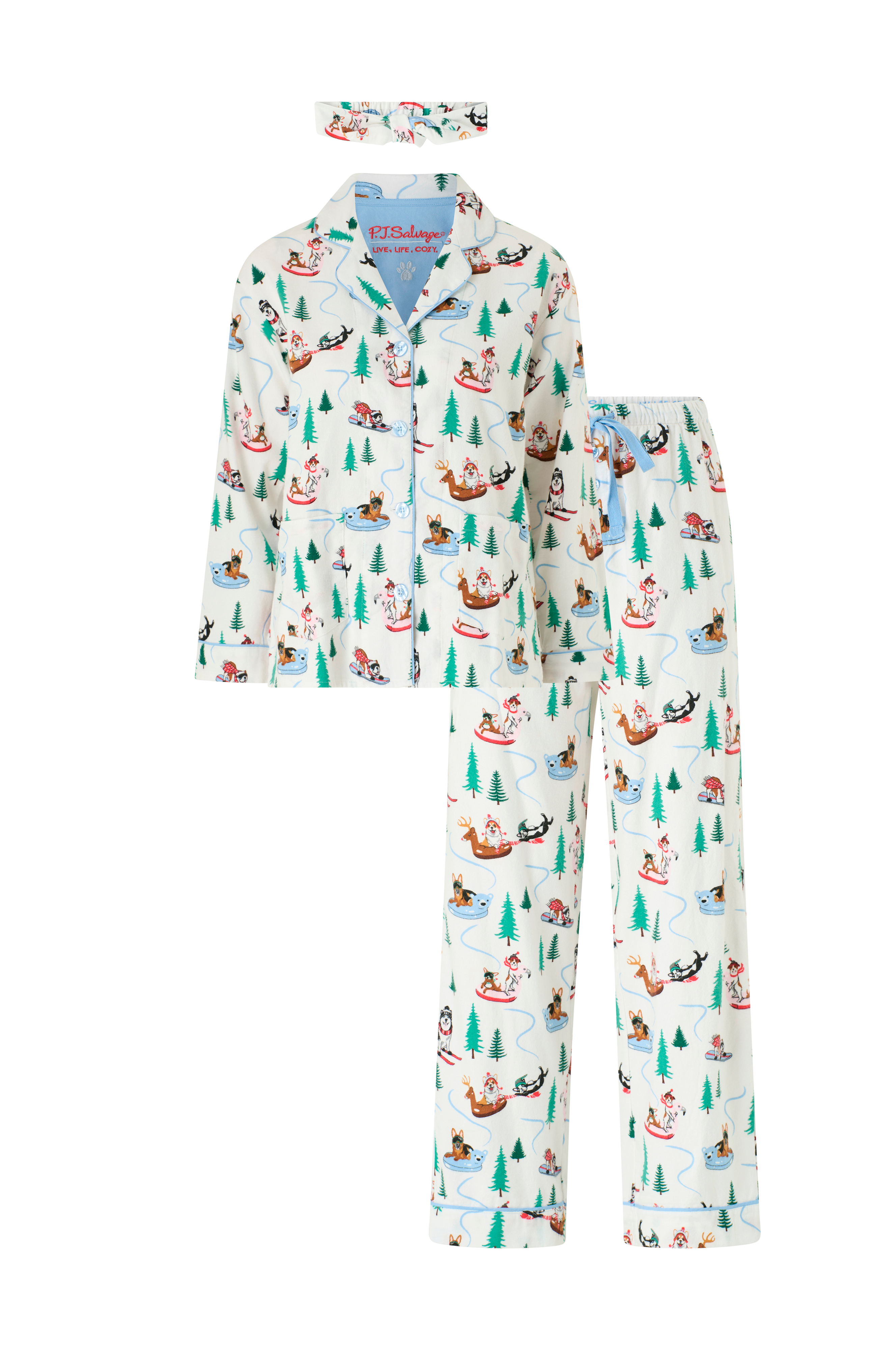 • 3-osainen, kuvioitu pyjamasetti• Pehmeä, mukava materiaali• Paita kauluksella, käänteellä, nappikiinnityksellä ja kahdella taskulla• Housut joustavalla vyötäröllä, kiristysnyörillä ja nappikiinnityksellä• Panta solmudetaljilla
