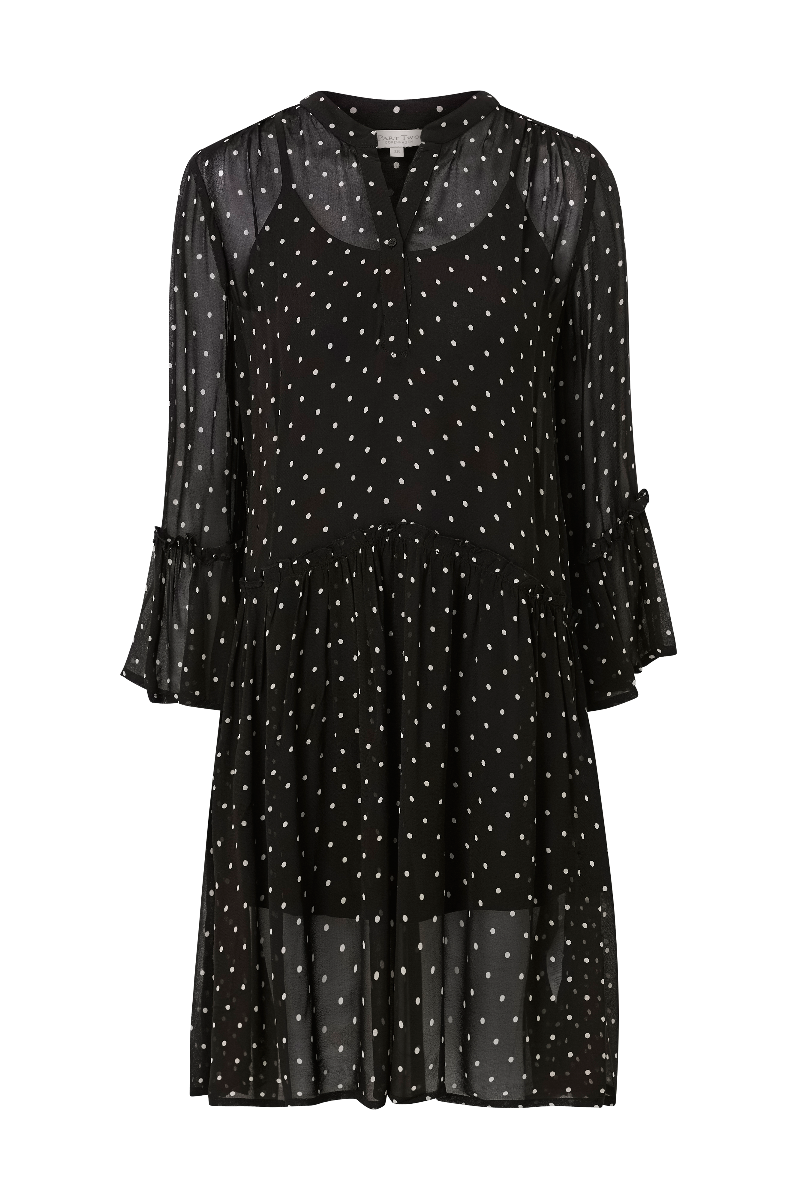 Part Two SophiaPW Dress -mekko. Levenevä malli sifonkia. Lantiolla poikkileikkaus ja pieni röyhelö. Leveä hameosa. Pyöreä pääntie, jossa päälleommeltu reuna sekä V-mallinen aukko ja lyhyt nappilista. Levenevät, väljät hihat, hihansuissa röyhelöreuna. Irrotettava trikooalusmekko, jossa kapeat, säädettävät olkaimet ja pyöreä pääntie. Pituus takaa n. 100 cm koossa 36.