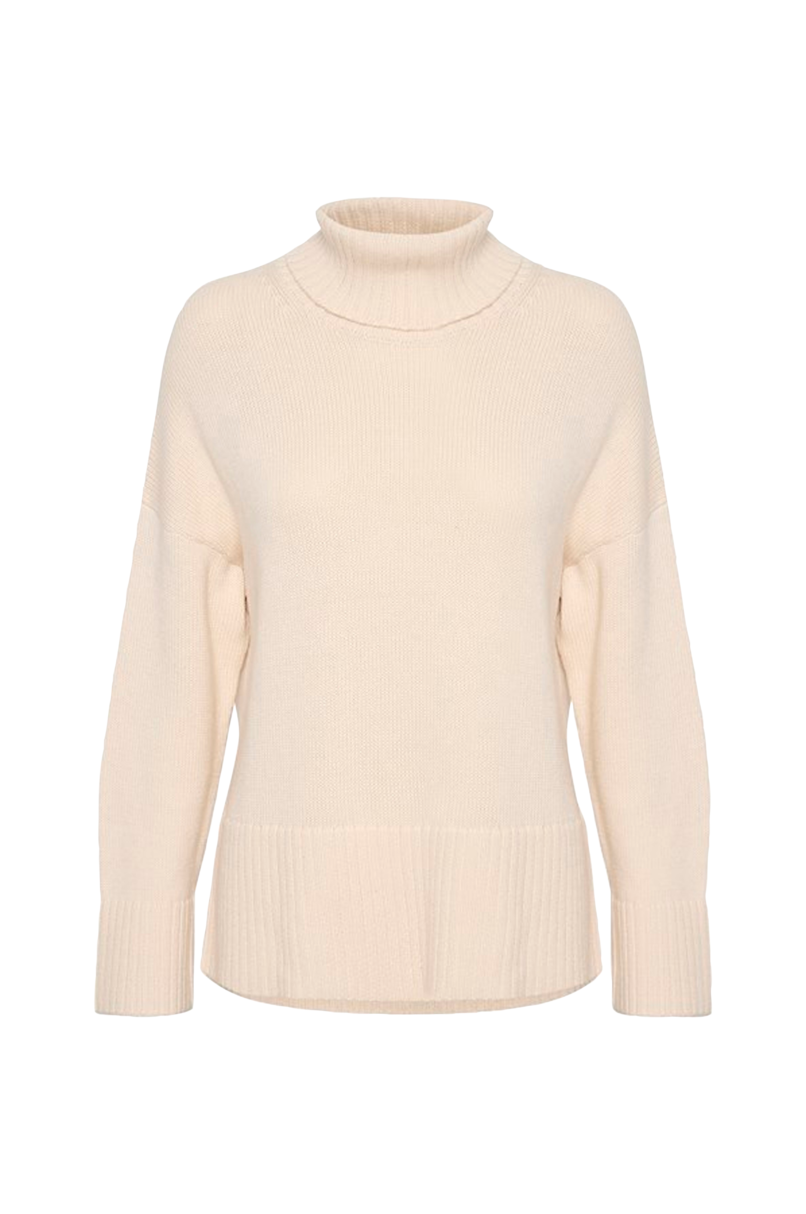 Neulepusero puuvilla/kashmirsekoitetta. Korkea joustinneulepoolokaulus ja madalletut olkapäät. Resorit hihansuissa ja joustinneulereunus helmassa. Sivuhalkiot ja pidempi takakappale.