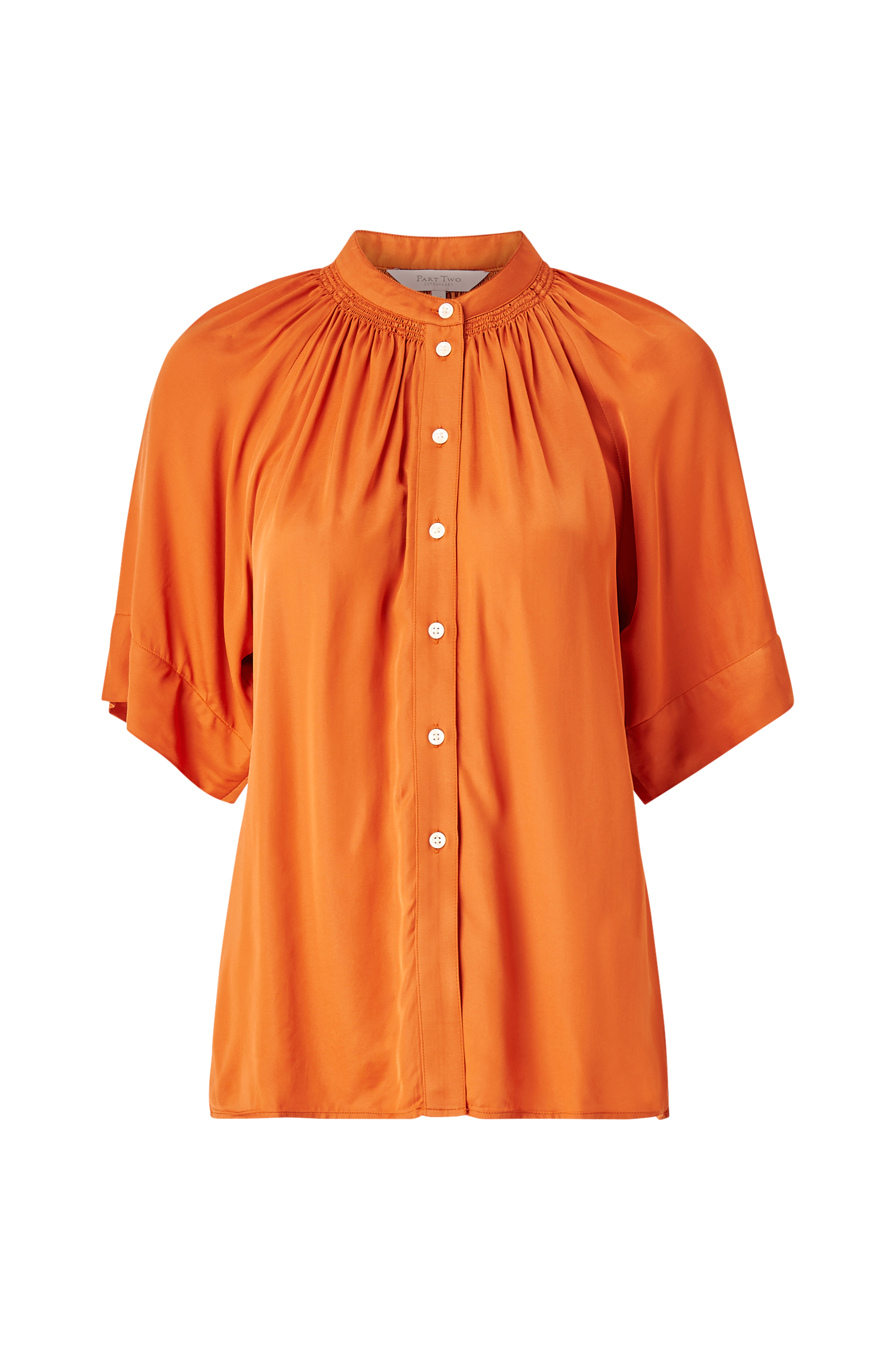 Part Two DoriaPW Sh -paita, jossa napit edessä. Poimutettu pääntie, jossa kapea smokkirypytys. Lyhyet, leveät hihat. Kiiltävää materiaalia.
