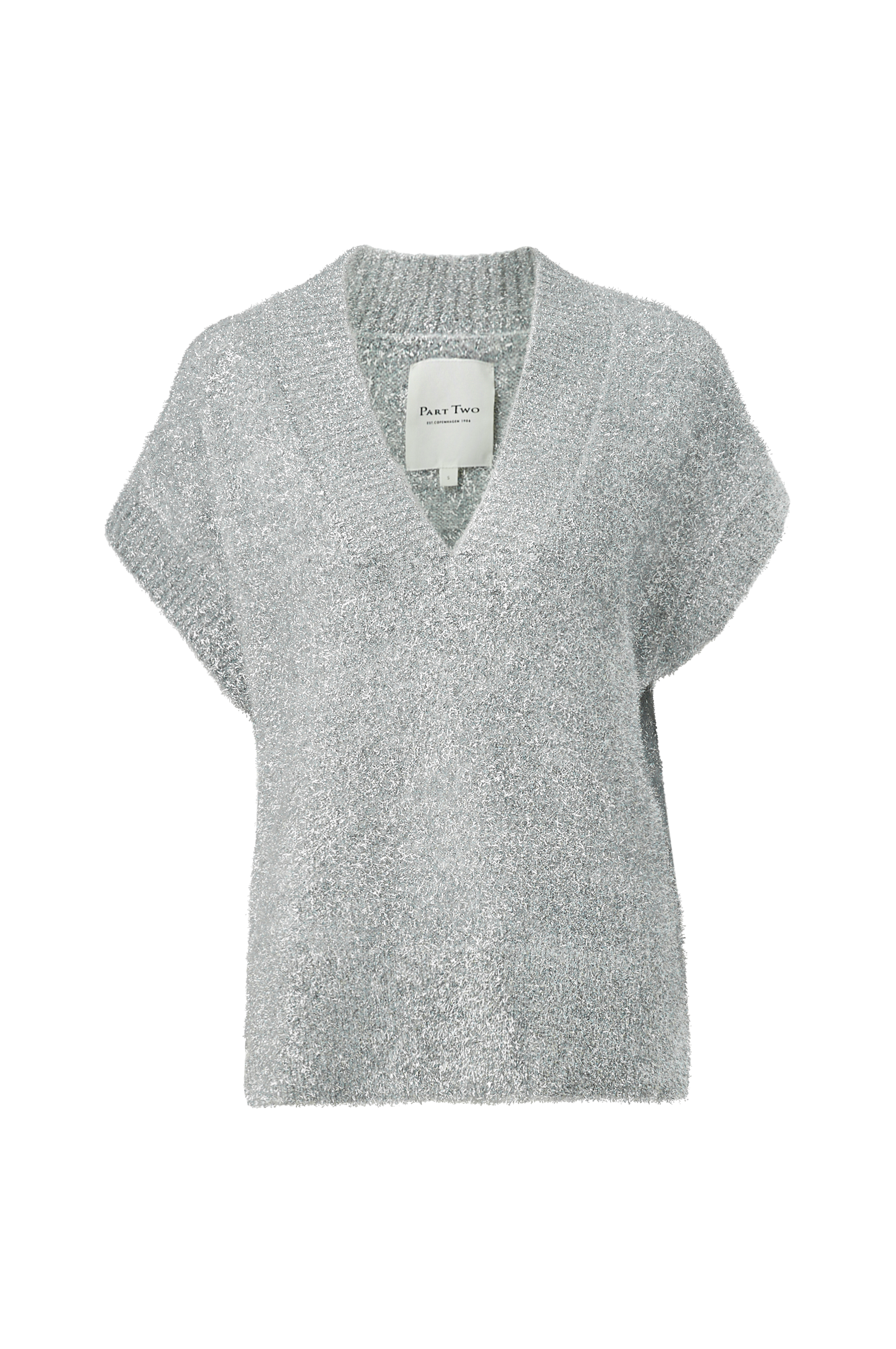 • Neulottu paita villasekoitteesta kimallelangalla• V-kaula-aukko• Lyhyet hihat• Halkio alhaalla sivuilla