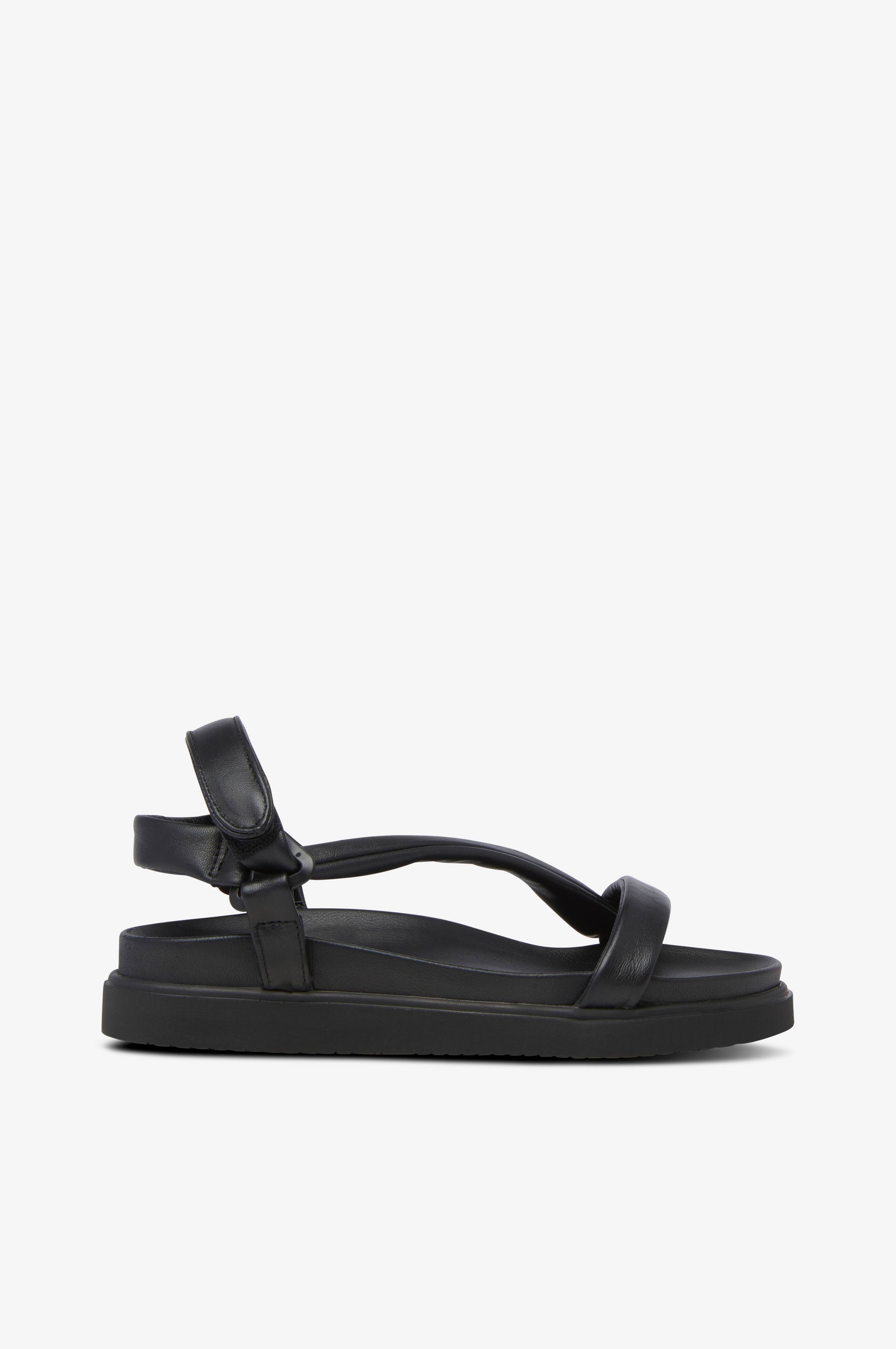 Sandaalit, joissa nahkaremmit. Säädettävä tarranauharemmi nilkassa. Muotoiltu sisäpohja ja litteä ulkopohja.