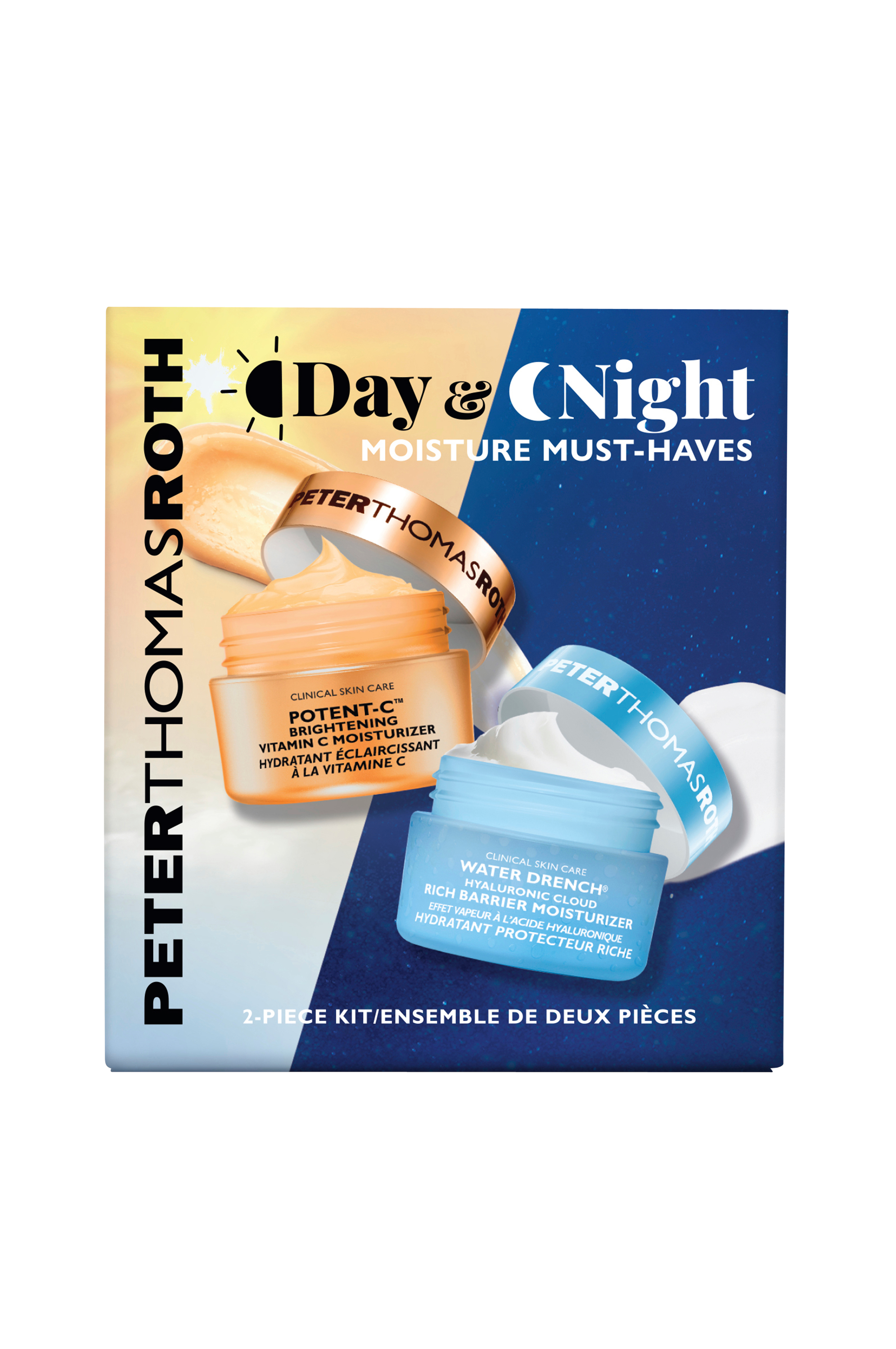 Day & Night Moisture Must-Haves on 2-osainen sarja kosteusvoidetta Am ja Pm, jotka auttavat kirkastamaan sameutta ja tarjoavat intensiivistä kosteutusta ja tehostettua suojaa. Käytä Potent-C™ Brightening Vitamin C Moisturizer -voidetta Am, joka auttaa parantamaan sameuden, epätasaisen ihon sävyn, tummien täplien ja ryppyjen ulkonäköä 10 % Thd Askorbaatti-C-vitamiinilla. Käytä Water Drench® Hyaluronic Cloud Rich Barrier Moisturizer -voidetta Pm, joka kastelee ihon suojaavalla moisture ja 30 %:n hyaluronihappokompleksilla.