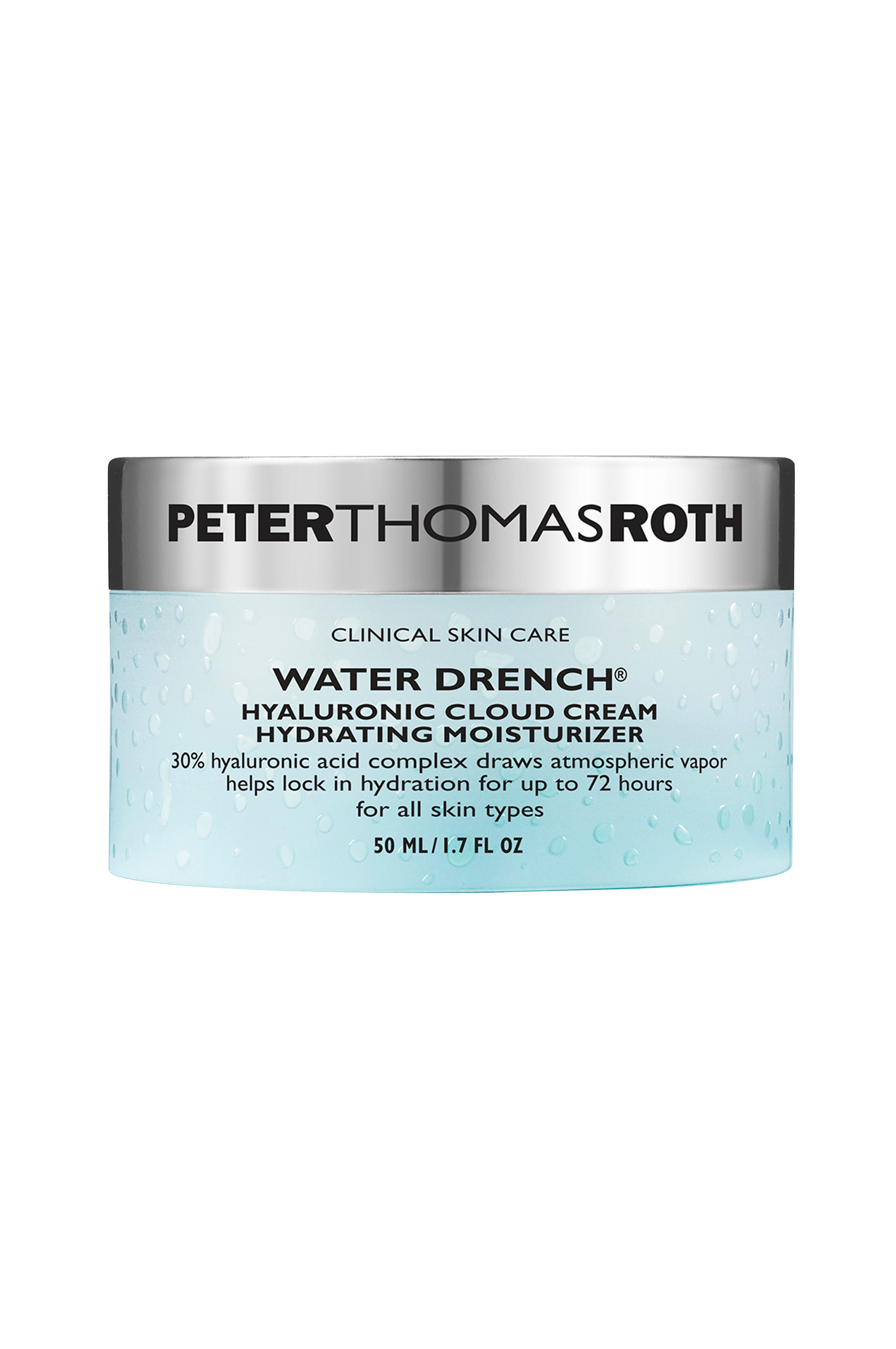 Peter Thomas Roth Water Drench® Hyaluronic Cloud Cream -voide kastelee ihon nestemäisellä pilvellä pörröisen kevyttä kosteutta, joka muuttuu silkkiseksi levityksen jälkeen ja tuntuu pehmeältä ja painottomalta kuin pilvet ilmakehässä. Kaava sisältää tiivistetyssä 30 %:n hyaluronihappokompleksissa kolmea molekyylikokoa sisältävää hyaluronihappoa, joka on voimakas kosteuttaja, joka vetää vettä puoleensa ja auttaa paisuttamaan ihon ulkonäköä kosteudella. Pentavitin® auttaa kosteuttamaan ihoa jopa 72 tunnin ajan - jopa puhdistuksen jälkeen* - ja ProHyal+® auttaa parantamaan ihon kosteutusta, jotta iho näyttäisi terveemmältä ja sileämmältä. Koostumus on rikastettu keramideilla, jotka auttavat kosteuttamaan ihoa ja jättävät sen pehmeän ja sileän tuntuiseksi samalla, kun juonteiden ja ryppyjen ulkonäkö vähenee näkyvästi. Kuivuu pilvenkevyesti ja tuntuu painottomalta iholla. Hajusteeton.