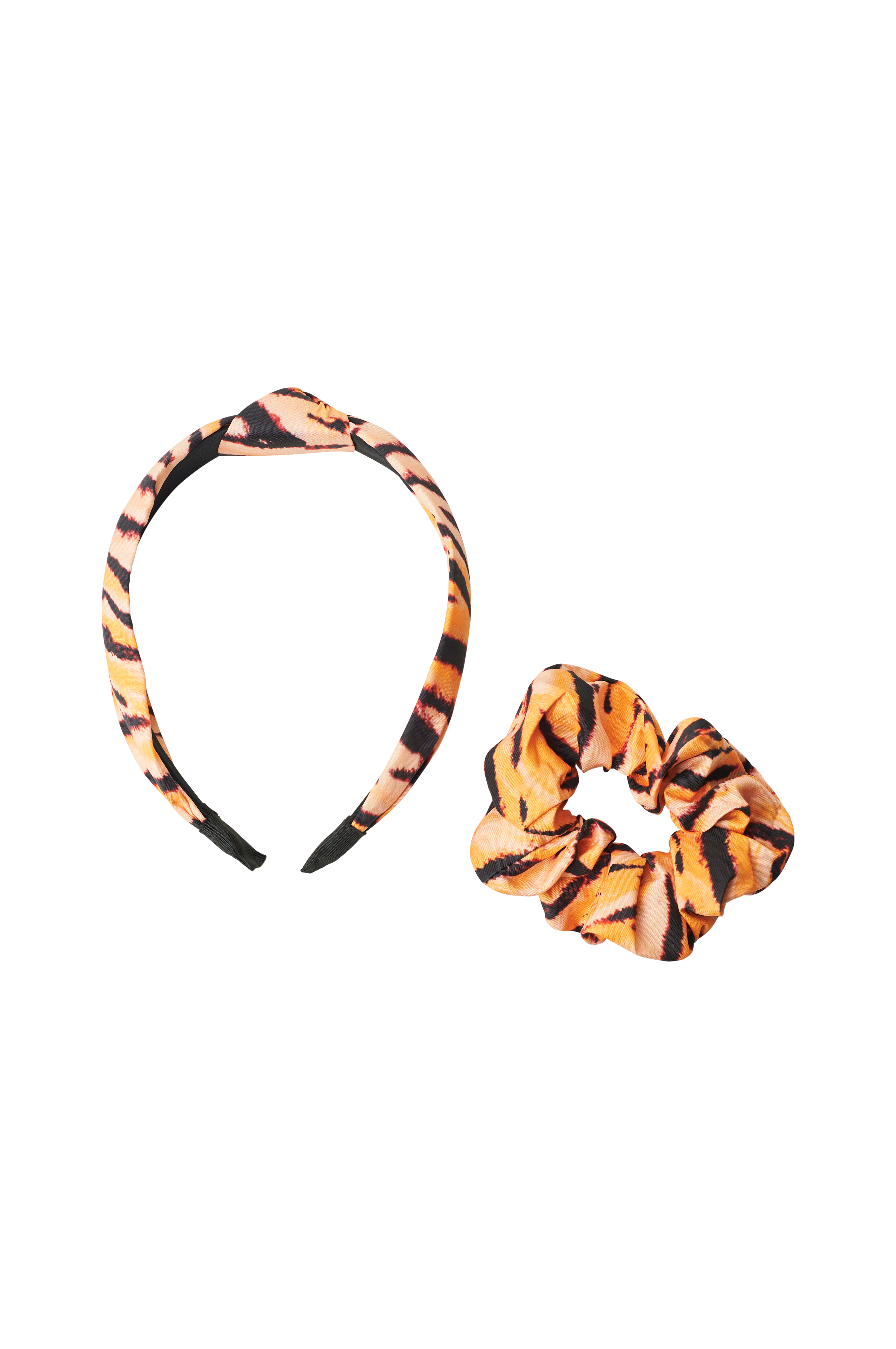 Yhteensopiva hiuspanta ja scrunchie. Hiuspannassa on koristesolmu ylhäällä.