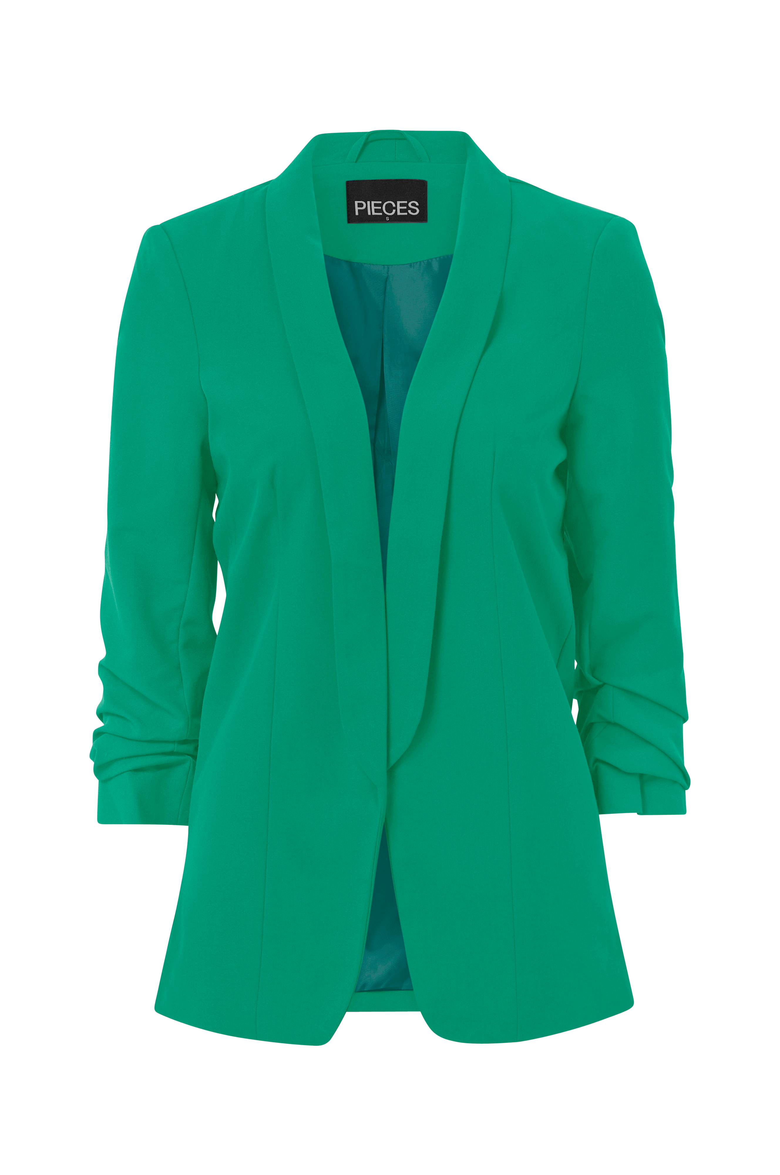 Pieces pcBoss 3/4 Blazer -jakku, jossa avoin malli. Saalikaulus ja 3/4-pituiset hihat, joissa poimutettu alaosa. Ohuet olkatoppaukset antavat kauniin istuvuuden. Hieman joustavaa materiaalia. Ohut kangasvuori.