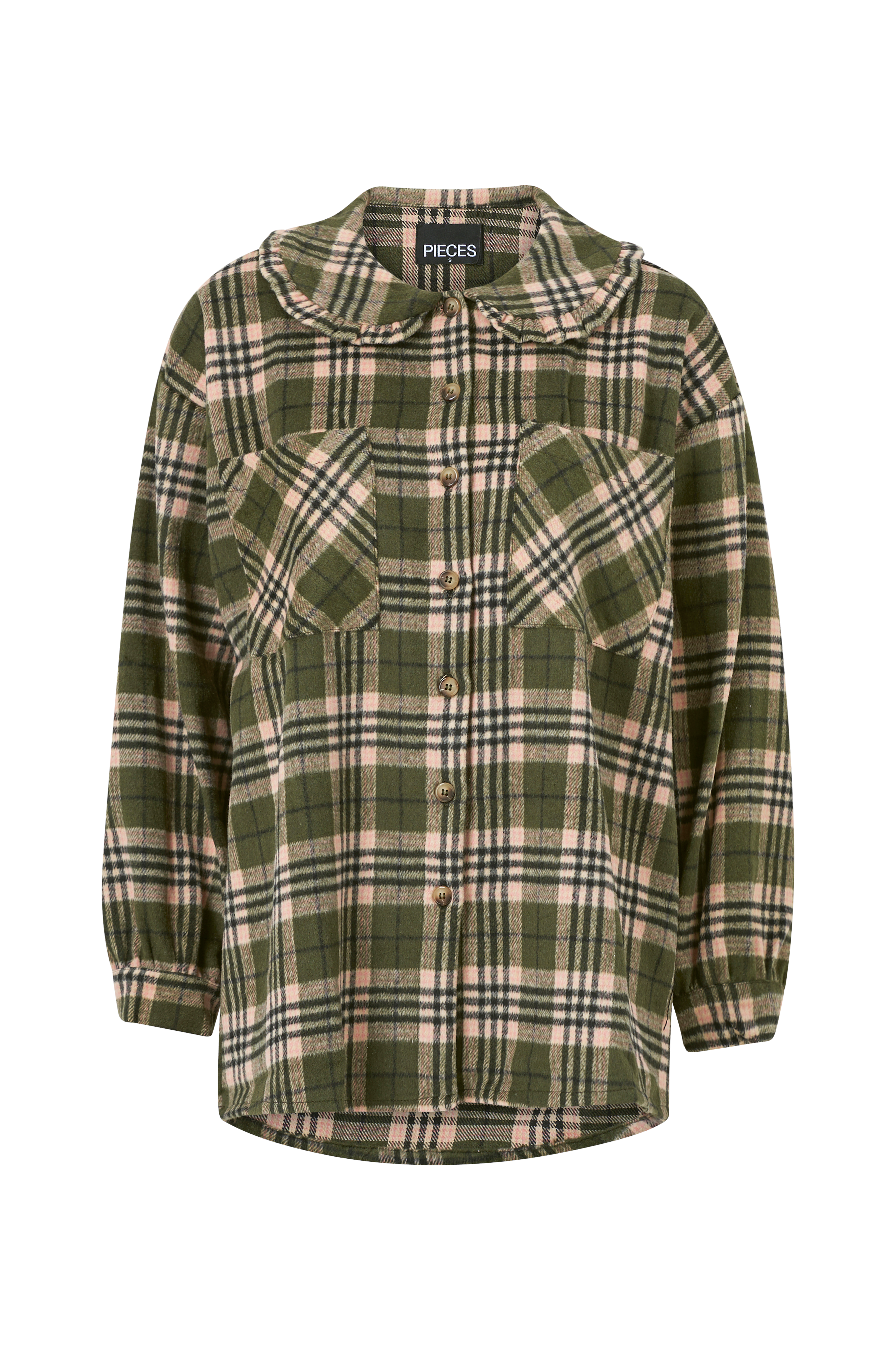 Pieces pcLonni LS Shacket -paitatakki. Suora oversize-malli ruutukuosista flanellia. Pyöristetty kaulus, jossa pieni röyhelö reunassa. Kokopitkä napitus edessä, kaksi päälleommeltua rintataskua ja pitkät hihat, joissa pieni kalvosin hihansuissa. Pituus takaa n. 80 cm koossa S.