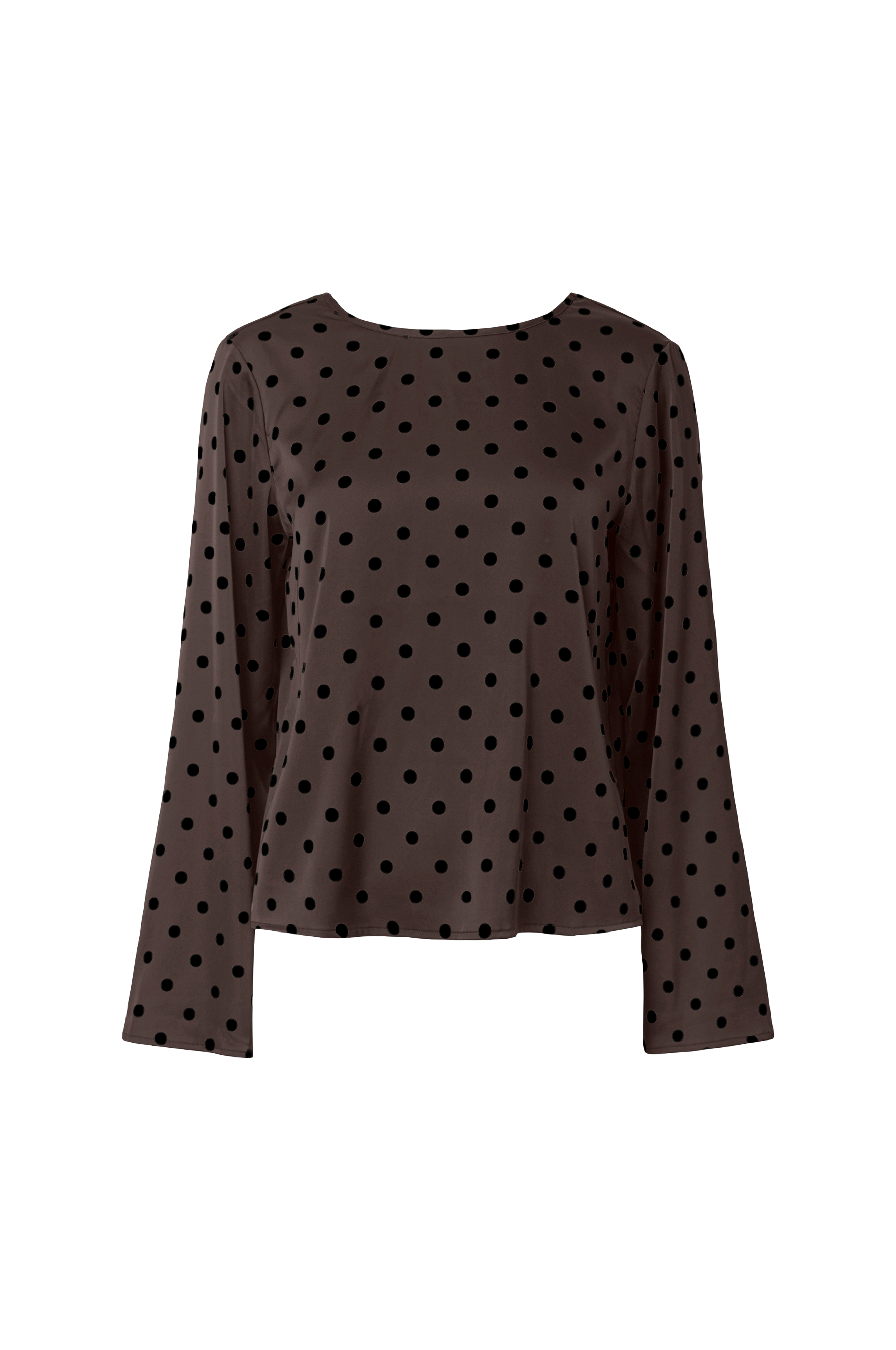 • Satinipaita pilkkukuviolla• Pyöreä kaula-aukko v-kaula-aukolla selässä• Pitkät trumpettihihat