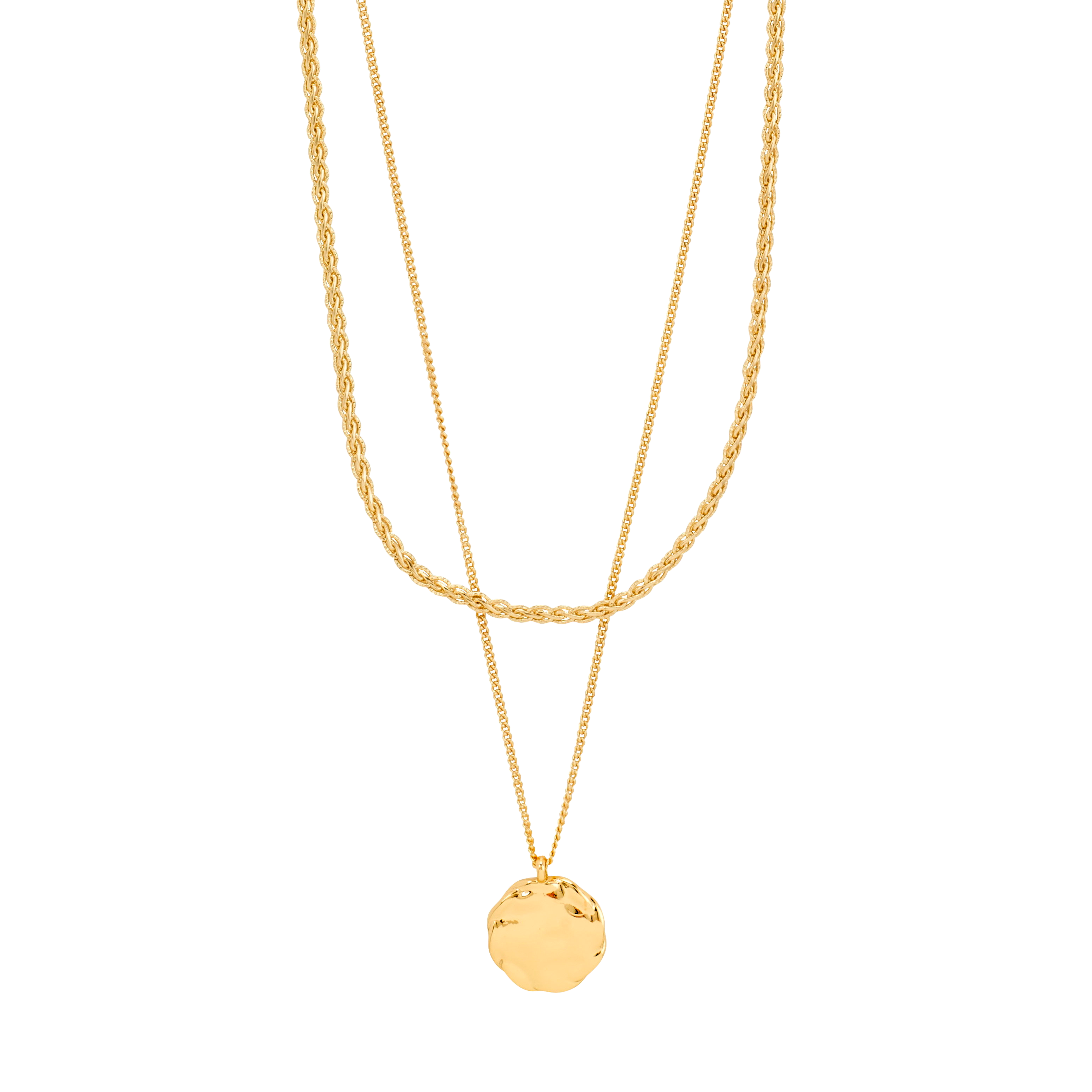 Tuplatyyliä! Kullattu setti, jossa on kaksi erilaista kaulakorua - toinen punottu ketju ja toinen kolikkoketju, jossa on maalaismainen, kiiltävä riipus. Ihanteelliset kerrostavat kappaleet pinoamaan tyyliä, joka vangitsee kauden trendejä, tai käytä niitä yksitellen minimalistisen lausunnon saamiseksi, joka kohottaa jokapäiväisiä asujasi. Yhdistä ylisuuren bleiserin tai valkoisen t-paidan kanssa, jotta saat aikaan vaivattoman ulkoasun, jossa on rento viehätys käyttämällä Declan -ketjuja. Kaulakorujen mitat ovat 38 cm / 42 cm + 15 cm:n jatkoketju, ja ne on valmistettu 99 % kierrätysmateriaalista - muotia, jossa välitetään planeetasta.