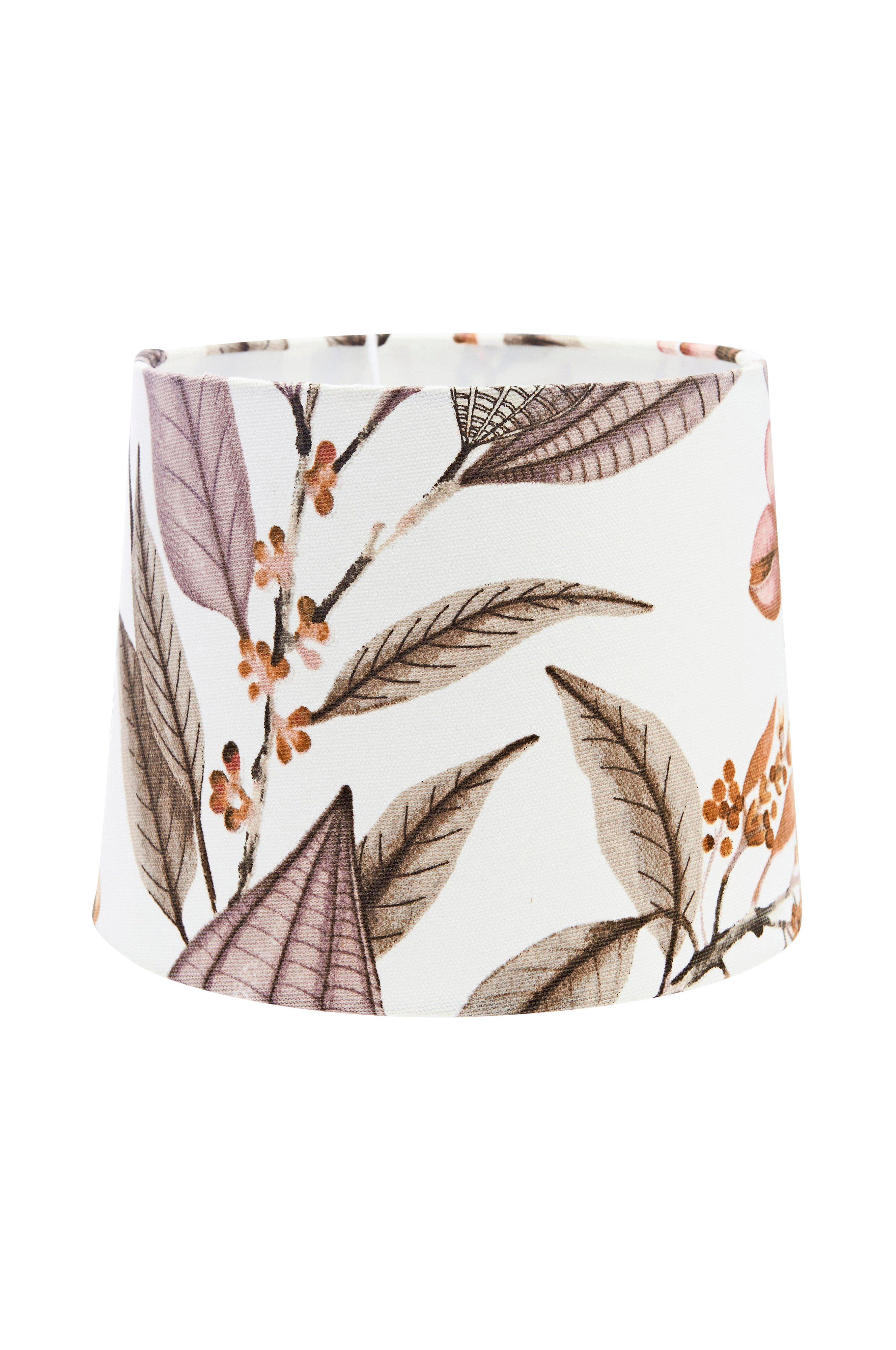 Sofia-lampunvarjostin kuviollista puuvillakangasta. Varjostimessa on painettu lehtikuvio ja vaalea sisäpinta, joka saa valon loistamaan kauniisti. Hieman levenevä muoto ja E27-rengaskiinnike. Leveys 20/17 cm.