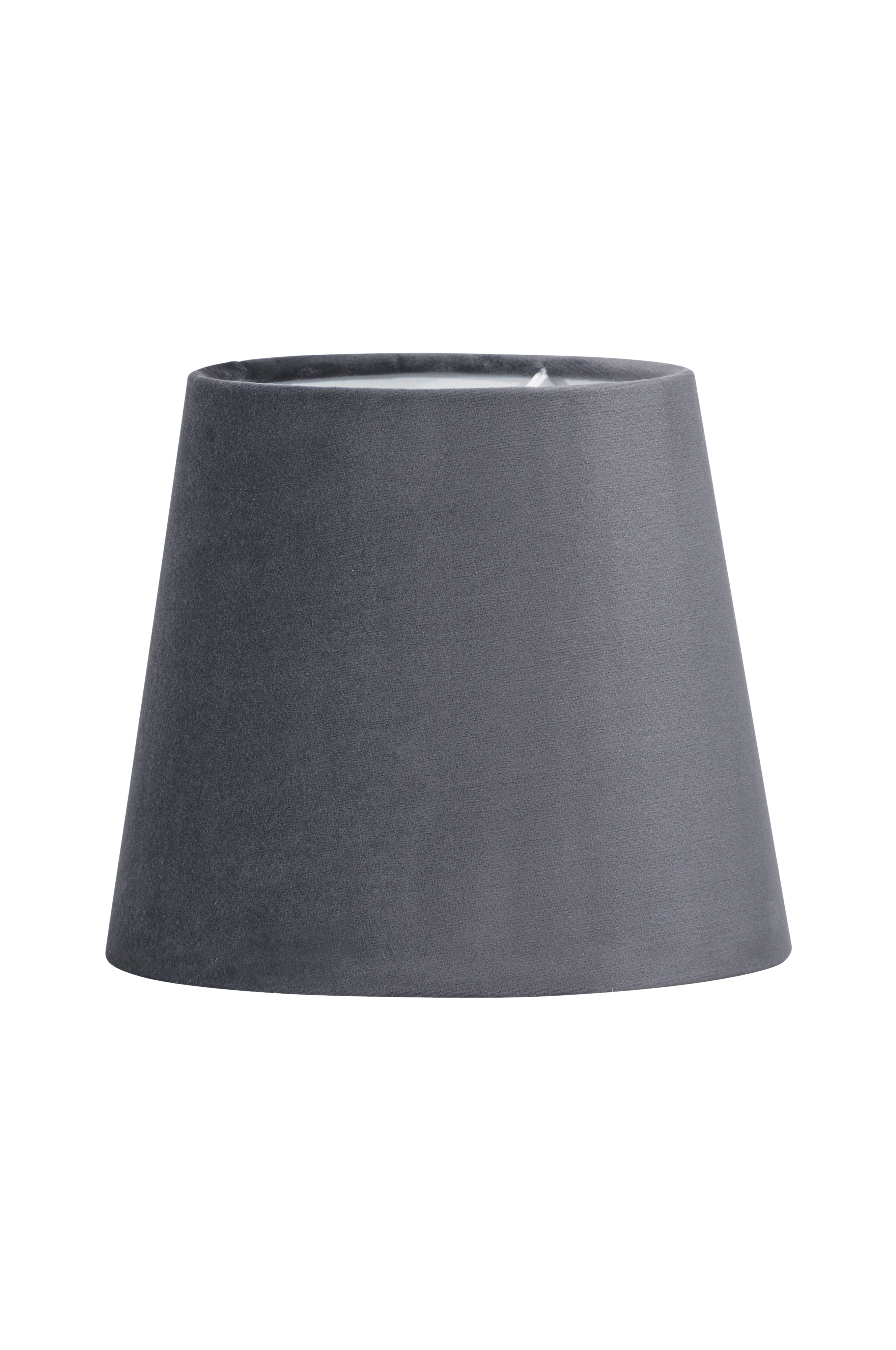 Mia-varjostin. Pyöreä lampunvarjostin sileää samettia. Korkeus 14,5 cm. Alareunan halkaisija 17,5 cm, yläreunan 13 cm. Pallolampun kiinnike 5,5 cm alareunasta.