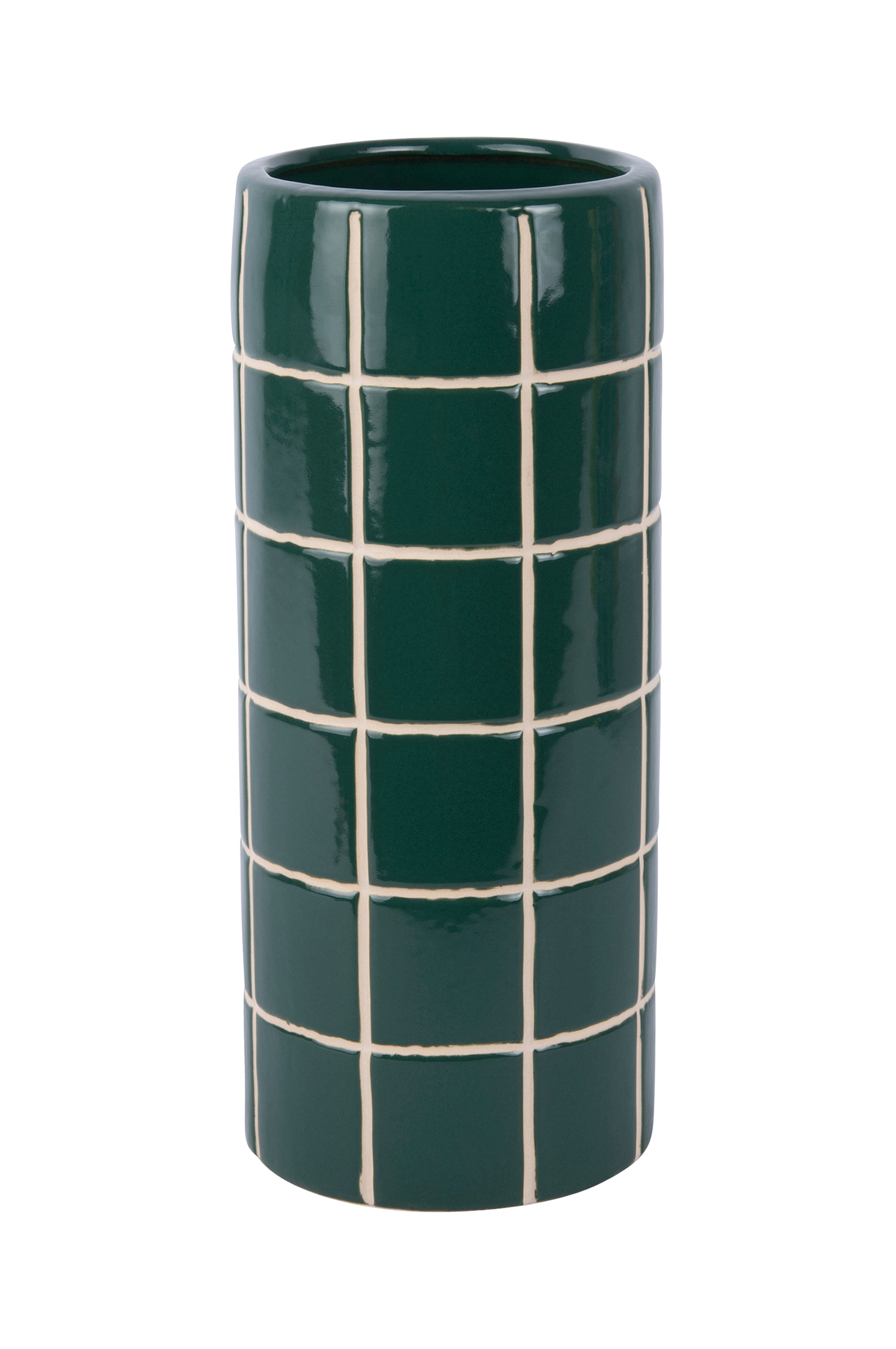 Nykyaika Retro Tiles pyöreä keskikokoinen maljakko, jossa on erottuva retro -laattakuvio, jossa on graafinen ilme.Sen lieriömäinen muoto tekee siitä sopivan koriste-esineen, kukkien kanssa tai ilman. Valmistettu keramiikasta.