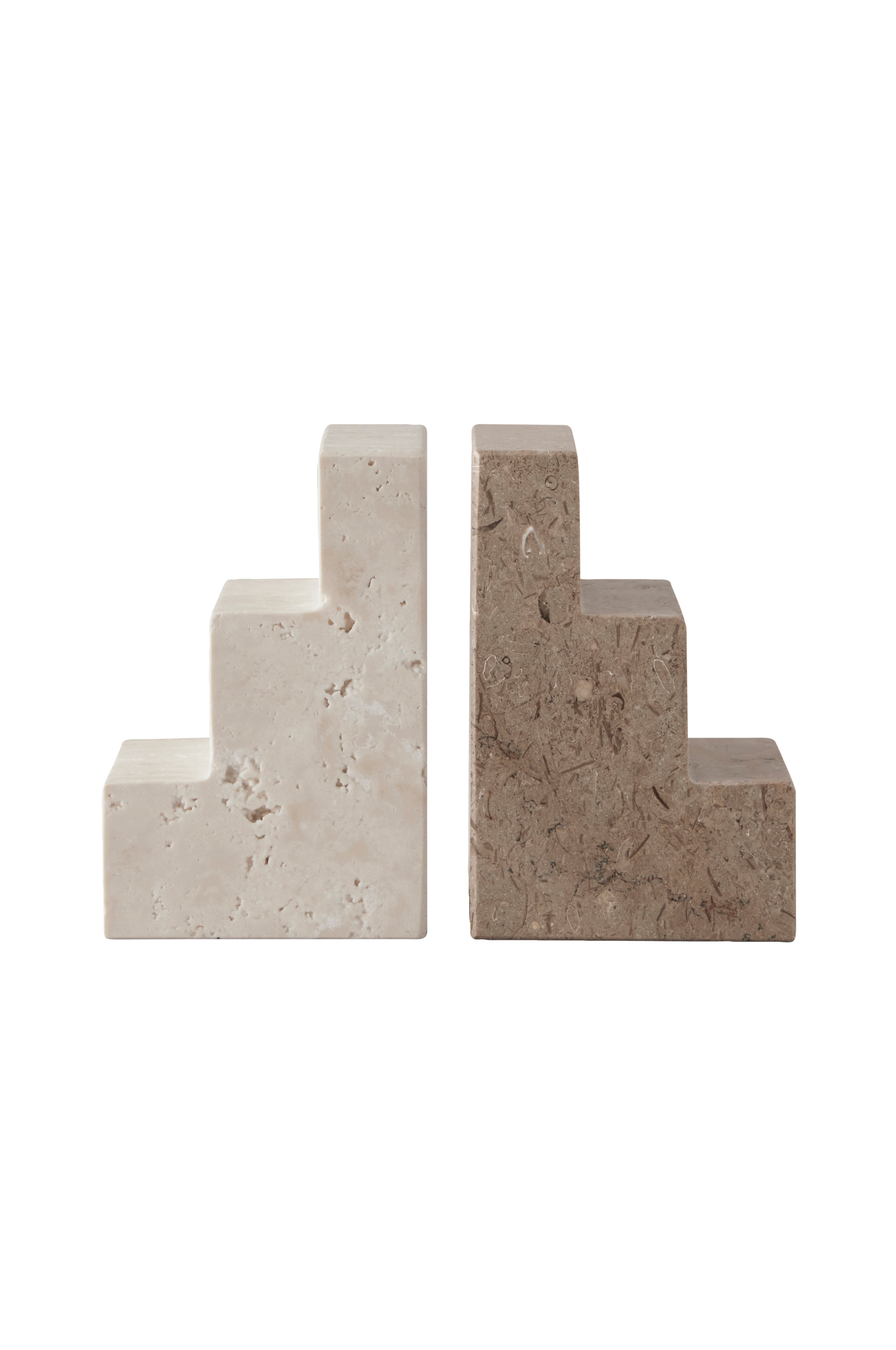 Luonnonkivestä valmistettu monipuolinen kirjatuki. Käytä niitä pitämään kirjasi siisteissä riveissä tai yhdistämään ne koristeelliseksi sisustusyksityiskohdaksi sohvapöydälle tai hyllylle. Kutsumme kirjatukea Stair Cubeksi, koska voit muotoilla tuesta portaikon tai kuution haluamallasi tavalla. Setti on valmistettu travertiinista ja kalkkikivestä, ja se toimitetaan kahden kappaleen pakkauksessa. Huomaa, että jokainen kirjatuki on leikattu kiven eri osista, joten jokainen pari on ainutlaatuinen ja niiden ulkonäkö vaihtelee. Korkeus 9 cm, leveys 6 cm ja syvyys 6 cm.