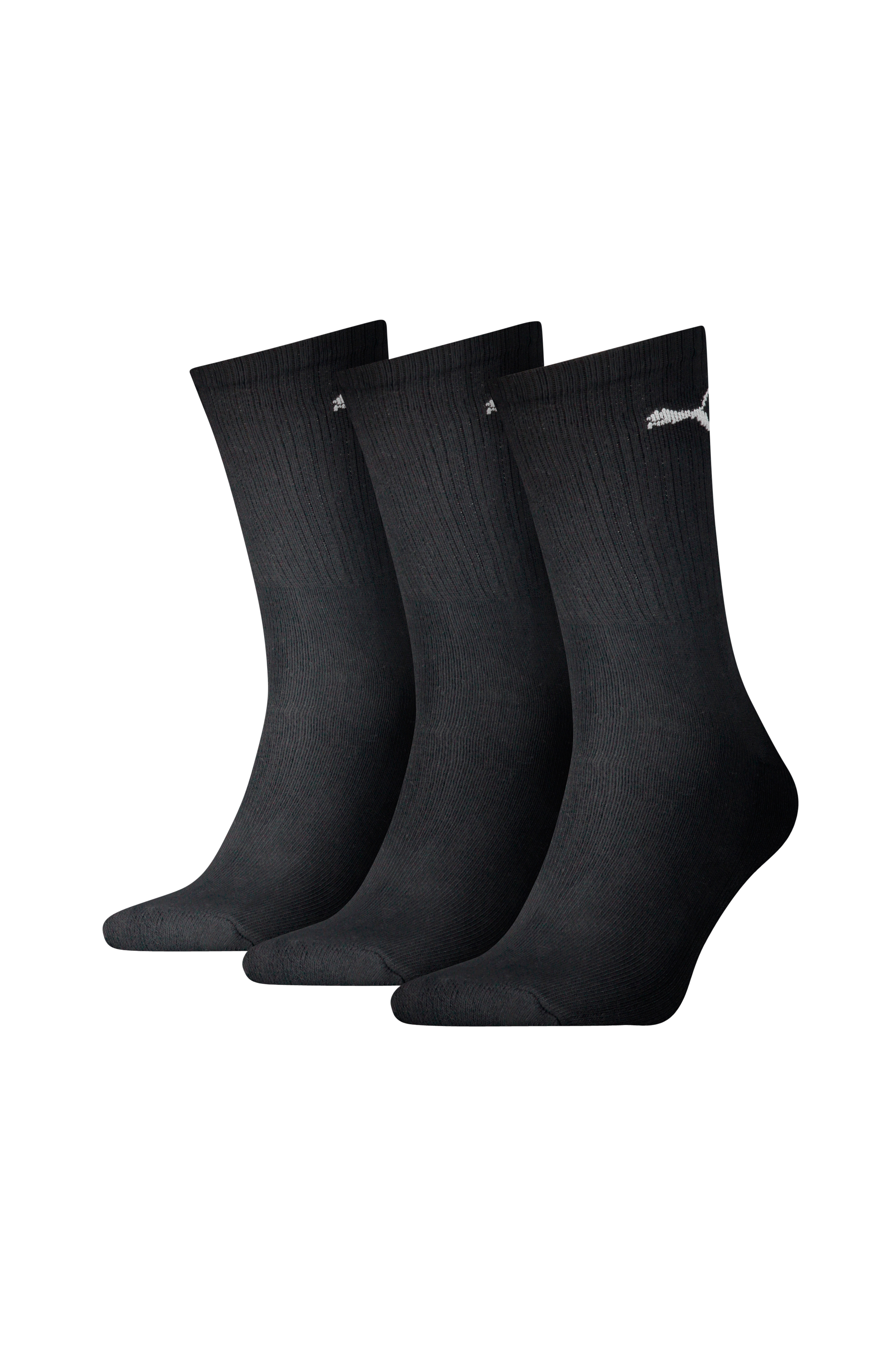 Puman Puma Sport -urheilusukat, 3 paria. Hieman paksumpaa materiaalia ja vaimennettu pohja. Joustinneulosvarsi, jossa neulottu Cat-logo. Litteät, hiertymiä ehkäisevät saumat kärjessä.