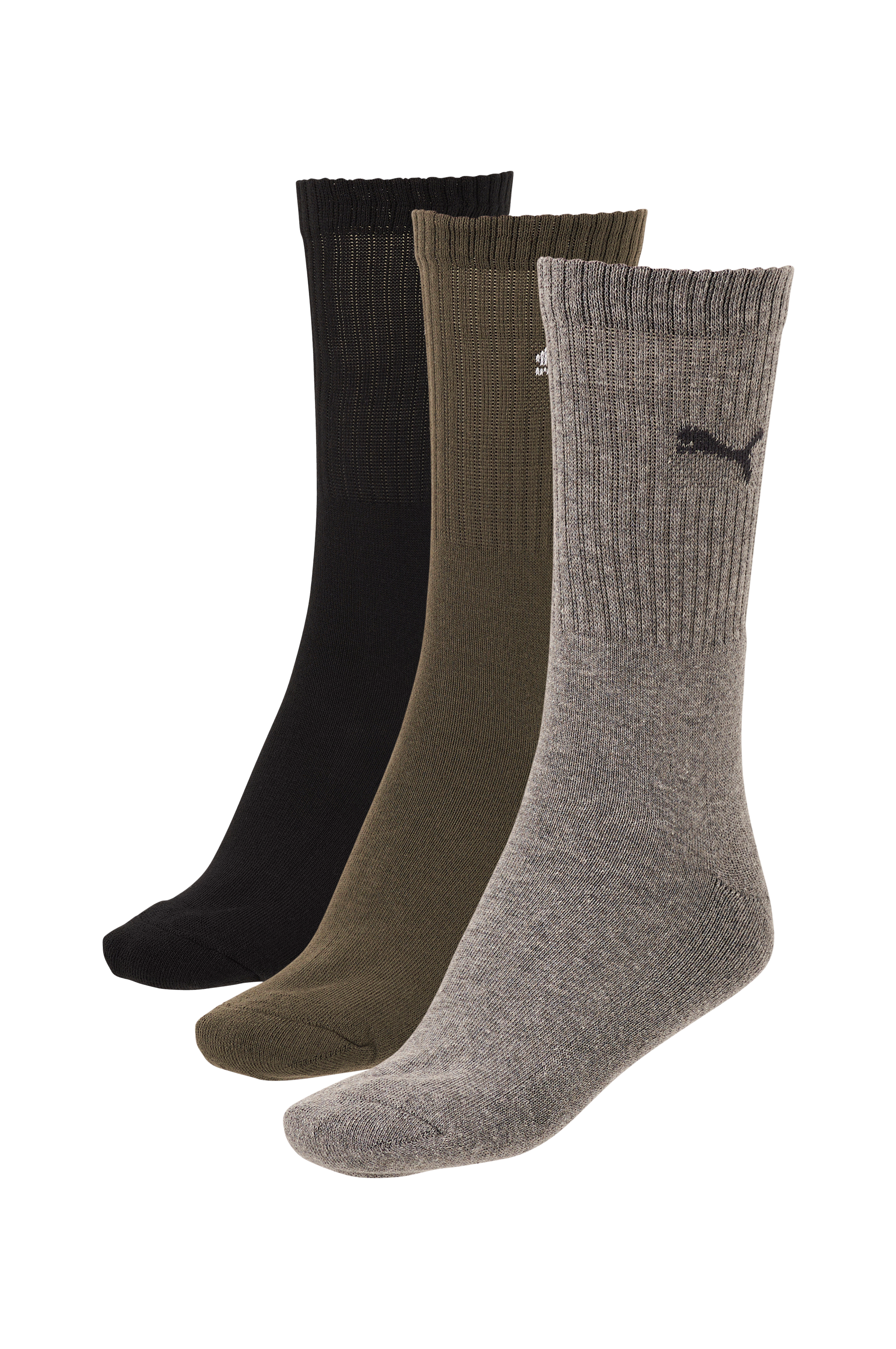 Puman Puma Sport -urheilusukat, 3 paria. Hieman paksumpaa materiaalia ja vaimennettu pohja. Joustinneulosvarsi, jossa neulottu Cat-logo. Litteät, hiertymiä ehkäisevät saumat kärjessä.